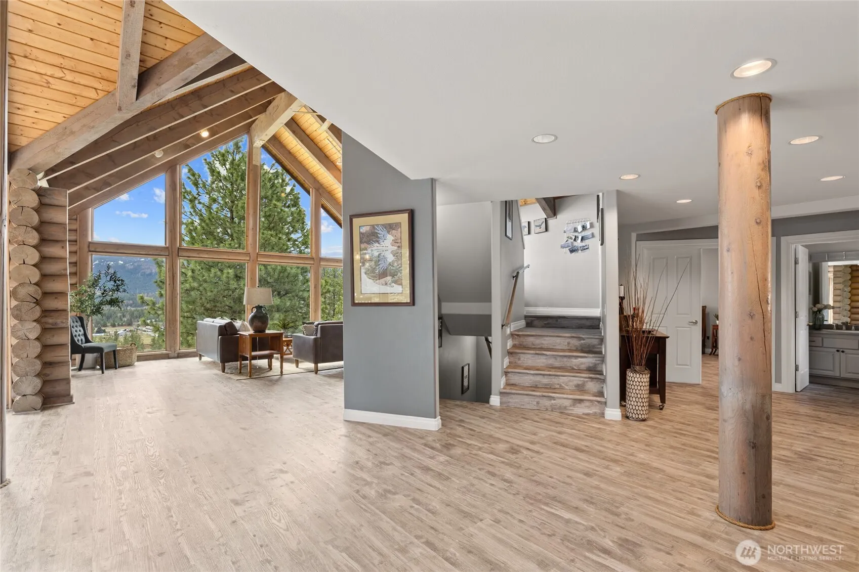 Breathtaking views at an amazing price! This stunning log home on 3 private acres perfectly balances country tranquility with everyday convenience—located mere minutes from Cle Elum. Soaring ceilings and expansive windows bathe the home in natural light, highlighting its warm, inviting interior. The main floor features a spacious primary suite with a gas fireplace, luxurious bath, and generous walk-in closet. The beautifully updated kitchen boasts sleek quartz countertops atop a large gathering island, ideal for entertaining. New LVP flooring throughout adds a touch of modern style and comfort. The finished daylight basement includes two bedrooms, two updated baths, and a generous bonus/media room, while the third-floor loft provides additional sleeping space, an ideal office location, or a cozy retreat. Two fenced areas and well-kept barns make this property a dream for animal lovers. Whether you’re looking for a full-time residence, peaceful getaway, or vacation rental, this mountain retreat offers endless possibilities.