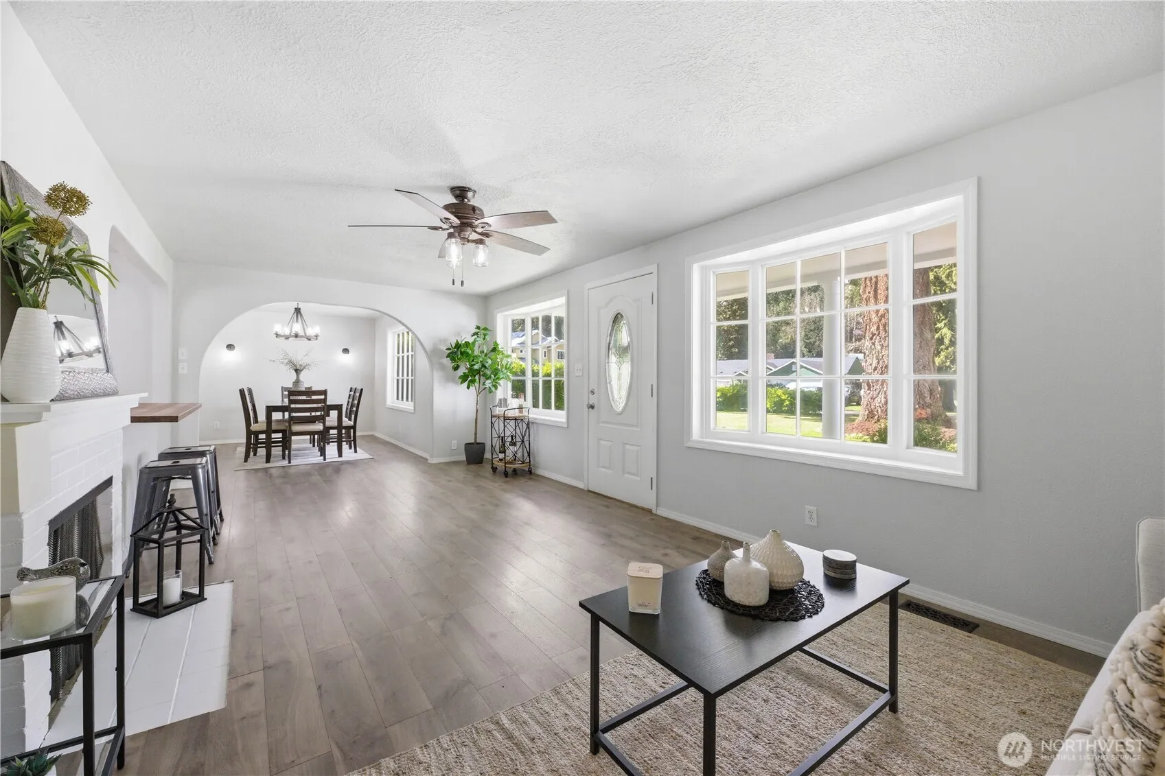 This beautifully remodeled, one-story home is tucked back on a sprawling 27,000 sq foot, park-like, fully fenced lot offering privacy, space and endless possibilities for outdoor living. From the charming, coved pass throughs to the built-ins, this 1947 home is the perfect blend of timeless character and modern upgrades. A bright, open-concept kitchen with custom cabinets, stunning solid walnut countertops and beautiful tilework looks out to the spacious living room and formal dining room. Off the kitchen, a huge recreation room steps out the patio, perfect for entertaining. The primary bedroom features a spacious walk-in closet, an updated bath complete with claw foot tub, tiled, walk-in shower, cozy fireplace and double vanities, plus 2 more bedrooms & a 2nd bath. Outside, you feel like you have your own private retreat with mature trees, a playground, a shop, a storage shed & room for an ADU, RV & boat parking. Plus, A/C for those hot summer days. Easy access to the freeway, shopping, restaurants, JBLM and bikeable to 3 lakes and NO HOA!