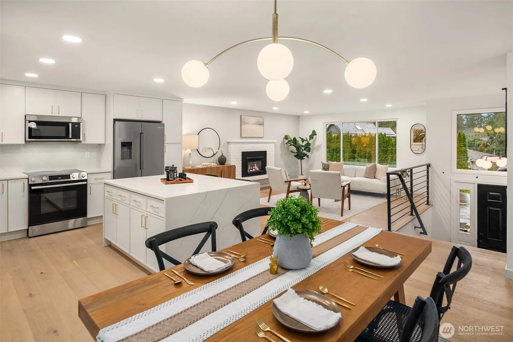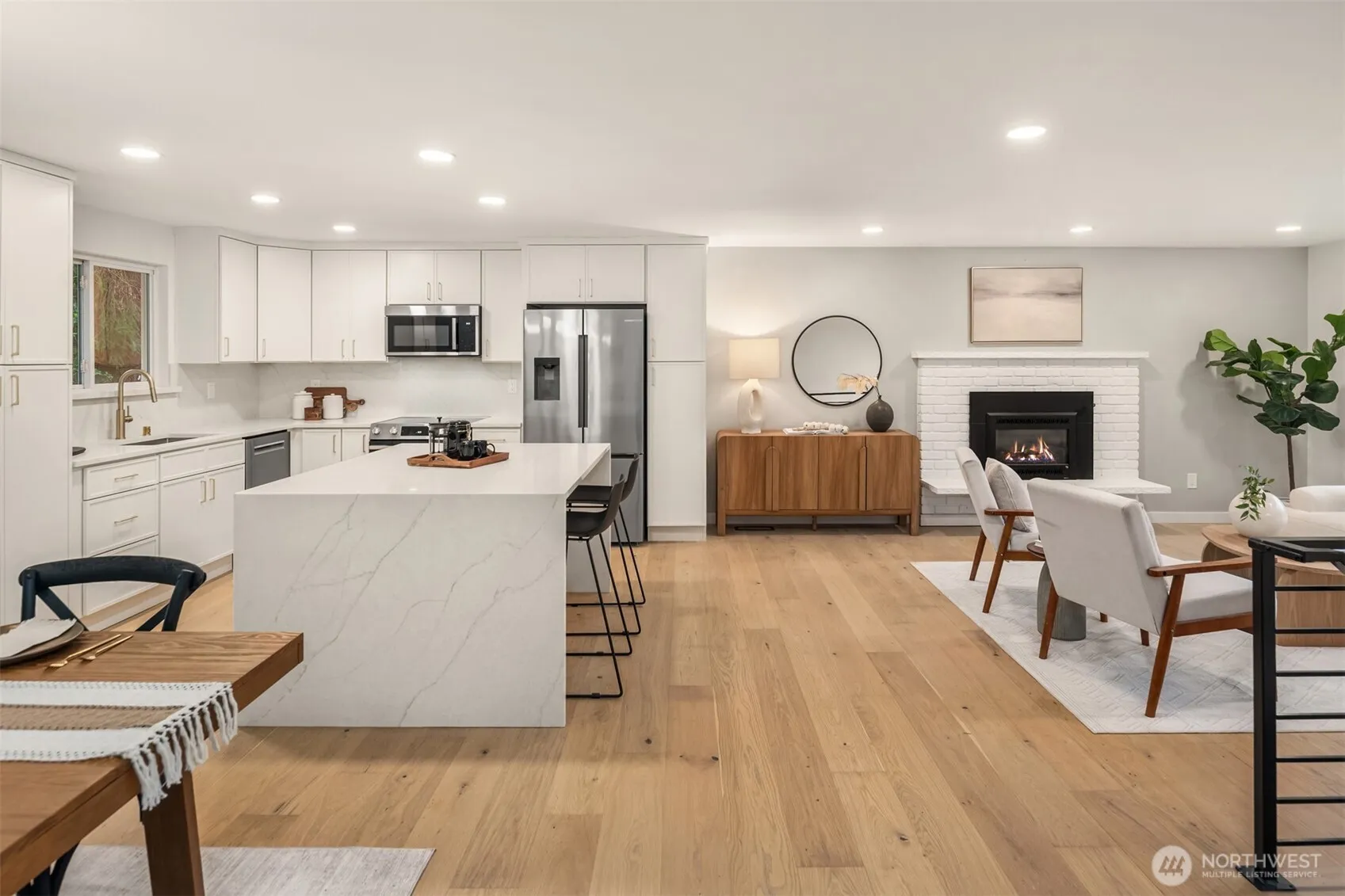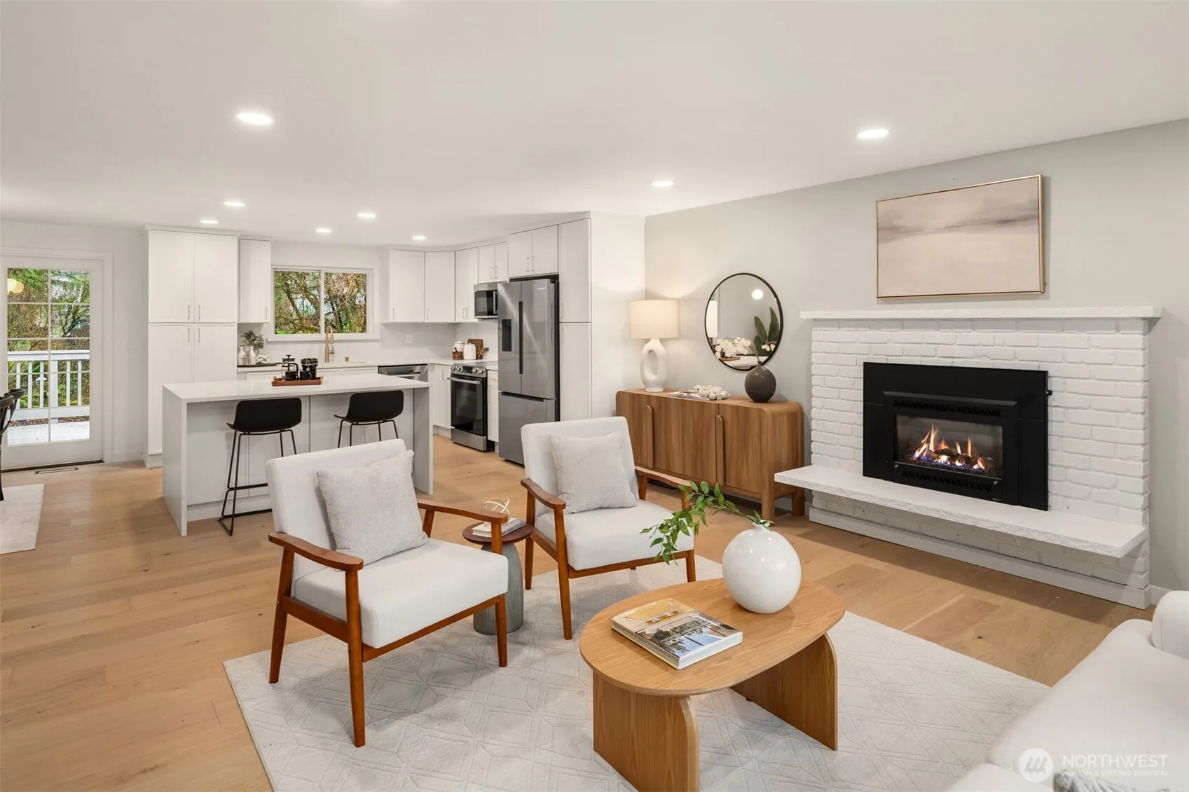 Completely reimagined home with DADU potential on 12,450 sq ft lot in highly sought-after South Rose Hill . Tucked away at the end of a private drive, this beautifully appointed residence offers style, comfort, and functionality throughout. The main level showcases white oak hardwood flooring, a stunning high-end kitchen featuring quartz countertops, shaker-style cabinetry, and stainless steel appliances. The open-concept living and dining areas are anchored by a cozy gas fireplace and provide seamless access to the outdoor deck, making it ideal for entertaining and enjoying warm summer evenings. The spacious primary suite includes a luxurious bath with tile floors and a custom surround. Two additional bedrooms and a full bathroom complete the main floor. Upon entering the lower level you’ll find a large family room ideal for gatherings or movie nights, an additional bedroom/flex space, a three-quarter bath, and a dedicated laundry room. Fully finished two-car garage adds convenience and practicality. Located within the top-rated Lake WA school district and offering an easy commute to both downtown Redmond and Kirkland and tech hubs. This home is just minutes from highly rated restaurants, parks, and everyday amenities.