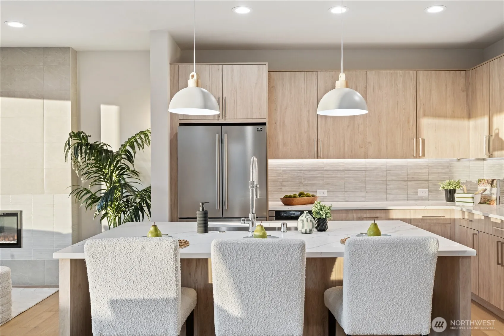 Merit Homes presents Wilder Lot 4! The 4-home community in desirable rose hill offers this thoughtfully designed two-story floorplan offering a reduced footprint without sacrificing luxury or livability. This home features 3 bedrooms, 2.5 bathrooms, a bright, open layout, and an attached EV-ready garage. Step inside to a light-filled open-concept main level ideal for both everyday living and entertaining. The gourmet kitchen showcases a quartz slab island with bar seating, custom soft-close cabinetry, dual-zone wine chiller, and a premium appliance package highlighted by an induction range. The great room is warm and inviting with a sleek contemporary linear electric fireplace and seamless access to the outdoor patio. A stylish powder bath completes the main floor, perfect for guests. Upstairs, the primary suite is a true retreat, filled with natural light and featuring a spa-inspired walk-in shower with bench seating and dual shower heads, plus a walk-in closet with custom shelving. Two additional bedrooms provide ample space, complemented by a full secondary bathroom and a well-appointed laundry room with quartz countertops and upper and lower cabinetry. Ideally located for effortless commuting with quick access to major employers including Microsoft, Meta/Facebook, Amazon, and EvergreenHealth. Enjoy close proximity to Kirkland Costco, The Village at Totem Lake, parks, walking trails, and top-rated schools.