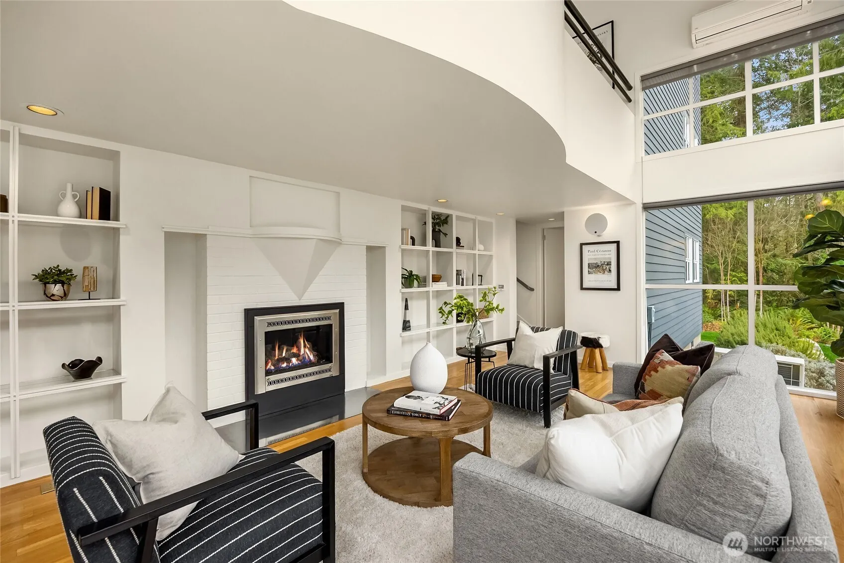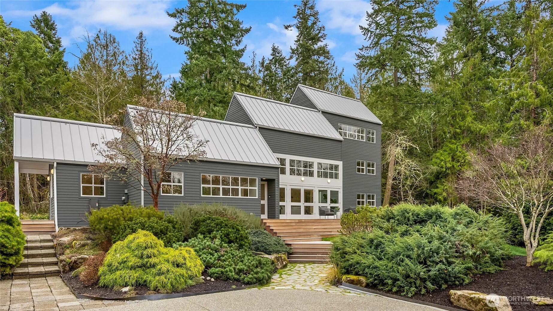 This exceptional home is a work of art-where modern design meets enduring comfort. Recently and thoughtfully renovated with substantial investment, every improvement reflects the guidance of trusted experts and a meticulous commitment to quality. A striking gabled roofline and beveled siding blend seamlessly with expansive walls of glass and soaring ceilings, creating an airy, light-filled interior that feels at once dramatic and welcoming. Endless windows frame nature at every turn, offering the extraordinary sensation of being outdoors while enjoying the comfort of home. Sunlight streams through silhouetted trees, transforming each room throughout the day. The open-concept living spaces are both refined and functional. Exposed white-painted trusses draw the eye upward, while southern light floods the interiors. French doors extend the living room onto a spacious deck, creating effortless indoor-outdoor flow-perfect for entertaining or quiet mornings immersed in nature. Thoughtfully designed 2/Bedrooms; 2/Baths; mezzanine-level office & treetop bonus room. Polished wood floors and gallery-white walls enhance the home’s clean, functional aesthetic-designed for both beauty and ease of maintenance. Set on a private, sun-soaked 1.79-acre lot with a two-car garage, ideally located on the southern tip of Bainbridge Island, moments from Pleasant Beach Village, Fort Ward Park, and Lytle Road beach access, this home offers rare tranquility with convenient access to island amenities.