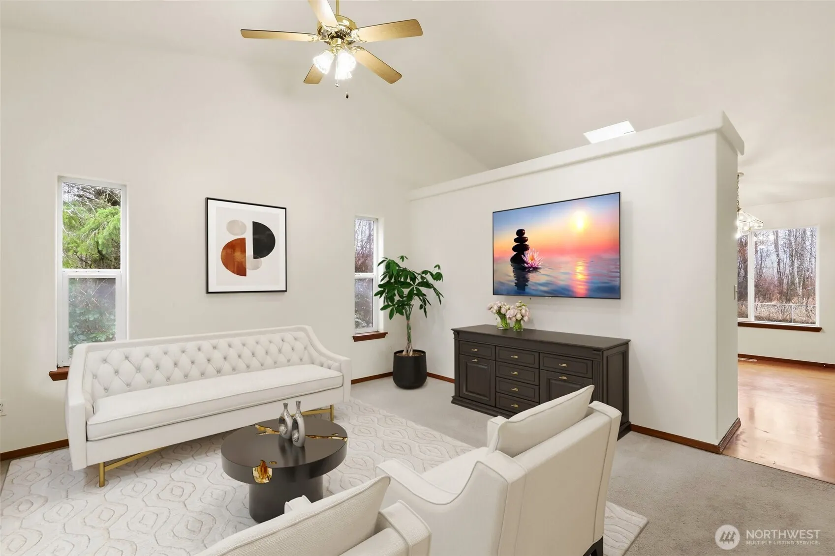 Discover this beautiful 3bd/2.5 bath Olympia home nestled on 9.49 peaceful acres, welcoming you with soaring vaulted ceilings and abundant natural light, featuring a spacious living room, an inviting kitchen with dining area and charming garden window, a cozy family room with propane fireplace, plus a convenient laundry room and half bath on the main level, while upstairs offers a generous primary suite, a full bath with skylights and roomy closet, along with two additional bedrooms and another full bath; recent updates include the roof and septic system, and year-round comfort is ensured with an electric furnace and heat pump for warmth in winter and cool relief in summer, all complemented by a 2-car garage with roof racks, and a huge partially fenced backyard with a large entertaining patio, raised garden beds, well pump house, and endless acres of stunning Northwest scenery, all just minutes from schools, shopping, entertainment, I-5, and JBLM.