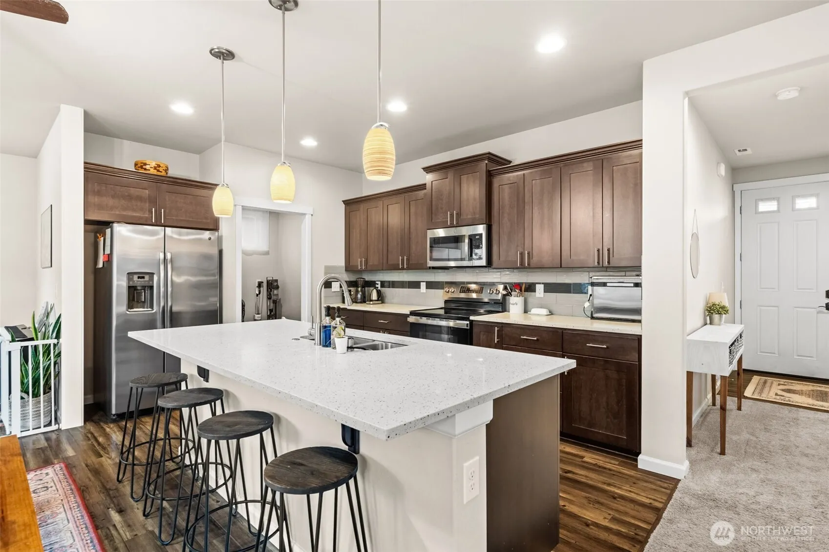 Welcome to Deschutes River Highlands! This home is a well-maintained 2,117 sqft home offering space, functionality, and efficiency in one of Tumwater’s most convenient locations. This 3 bed, 2.5 bath layout features an open-concept main floor with great flow for everyday living and entertaining, plus a dedicated micro office space for work-from-home flexibility. The kitchen is upgraded with quartz countertops, enhanced cabinetry, and stainless steel appliances that stay. A practical mudroom area and oversized pantry add the storage today’s buyers are looking for. Upstairs you’ll find a large loft, incredibly spacious bedrooms, and a convenient utility room. The home is equipped with a 90% efficient heat pump for year-round comfort, and solar panels help offset electrical costs. Enjoy the slider doors that open to a covered patio overlooking the fully fenced, manicured backyard, complete with a matching storage shed for convenience. Just minutes to freeways, shopping, Munn Lake boat launch, and minutes to Pioneer Park — this location offers both accessibility and outdoor lifestyle.