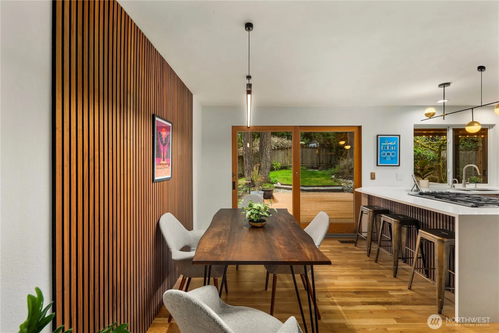 Beautifully updated NW Contemporary nestled in Crestwood Park, this thoughtfully upgraded 4 bedroom, 2.5 bath home blends warm architectural character w modern upgrades. A stunning vaulted cedar ceiling anchors the main living space while expansive windows & hardwood floors create a bright, inviting interior. The remodeled kitchen pairs style & function w quartz countertops, refined cabinetry, updated lighting, stainless steel appliances & a pull-out pantry offering ample storage. It opens to an expansive, custom rebuilt deck w pergola & lighting. Outdoor spaces have been reimagined w upgraded hardscaping & fire pit, creating a private setting for relaxing, gathering or play. Spacious primary suite offers a peaceful retreat complemented by a beautifully remodeled bath w dual vanities, contemporary brass fixtures & sleek glass shower. Two additional bedrooms upstairs & a stunning remodeled guest bath provide comfortable accommodations for residents or guests. Lower level offers flexibility w a potential 4th bedroom & office or guest room, plus an expansive entertainment space featuring polished concrete floors, custom slat-wood accents, a fireplace & fantastic home theater setup including a 125” screen, projector, surround sound wiring & blackout blinds. Dual heating & cooling systems keep you comfortable year round: a new efficient heat pump (heat & A/C) + a new backup furnace. Wonderful neighborhood w nearby walking & biking trails. Top rated Bellevue schools.