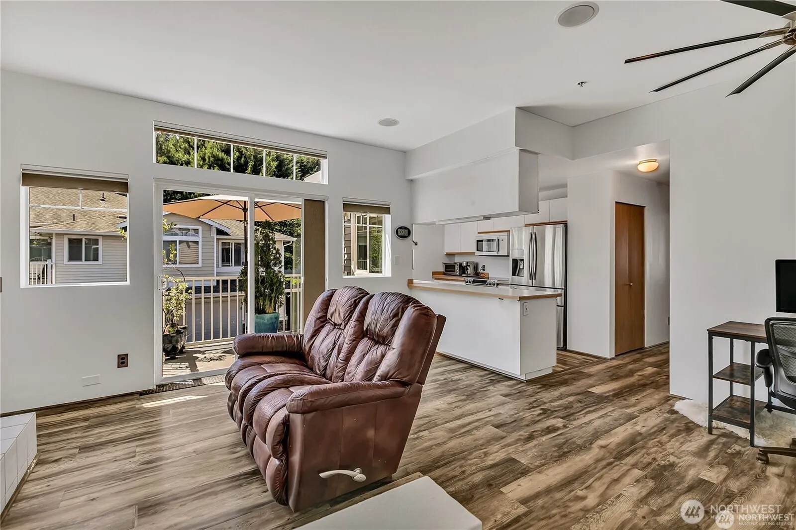 Welcome home to this light filled, open-concept condo at The Ridge at Riverview. Soaring ceilings highlight the spacious living and kitchen area, perfect for both everyday living and entertaining. Enjoy newer appliances, a cozy fireplace, a convenient laundry nook, and a private deck ideal for morning coffee or evening relaxation. Stylish waterproof Pergo laminate floors with radiant heat add comfort and durability, while energy-efficient Bali cellular blinds enhance year-round comfort. The generous bedroom features a walk-in closet, and the attached one-car garage with extra storage. Tucked away in a quiet, safe community bordered by a lush greenbelt, yet perfectly located near I-5, Hwy 167, Light Rail, and Sea-Tac Airport, this home offers the ideal blend of serenity and convenience. Repaired-Replaced 2025: Vinyl siding and weather proofing for building, Deck and Railings, Windows in kitchen and living room, Sliding glass door, Transom and gutters.