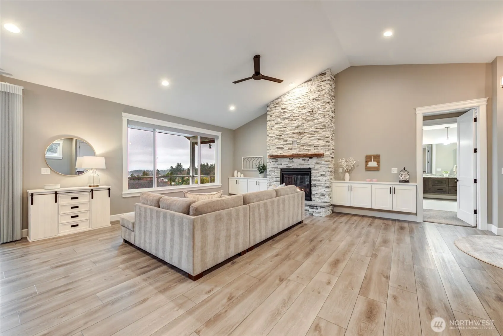 Perched in desirable Utsalady Heights, this stunning home captures unforgettable sunsets and sweeping views of the Sound, Whidbey Island, and Mt. Baker—beautifully framed through expansive windows and enjoyed from the spacious covered deck. Designed for effortless living and entertaining, the open Great Room floor plan features soaring vaulted ceilings and a sought-after primary bedroom suite on the main level. At the heart of the home is a truly exceptional chef’s kitchen with elegant self-close cabinetry, a massive gathering island, and a premium 36” Bertazzoni dual-fuel range & pot filler-perfect for weeknight meals or holiday hosting. Just off the kitchen, a versatile bonus space offers the flexibility of a home office or an oversized walk-in pantry. The lower level extends the living space with 2 additional bedrooms, a full bathroom, a home theater room, convenient kitchenette, a second laundry room, and a large family room ideal for guests or multi-generational living. Car enthusiasts and hobbyists will appreciate the impressive 966 sq ft finished garage featuring an epoxy floor, extensive built-in cabinetry, and a finished room above(not included in asf) for added storage or? Enjoy evenings gathered around the firepit, admire the beautiful landscaping and relax on the patio or deck while taking in the beauty. Incredible views, high end finishes, & location close to Beaches, paved walking trails, parks, and a grocery store and restaurants make this home a true treasure.