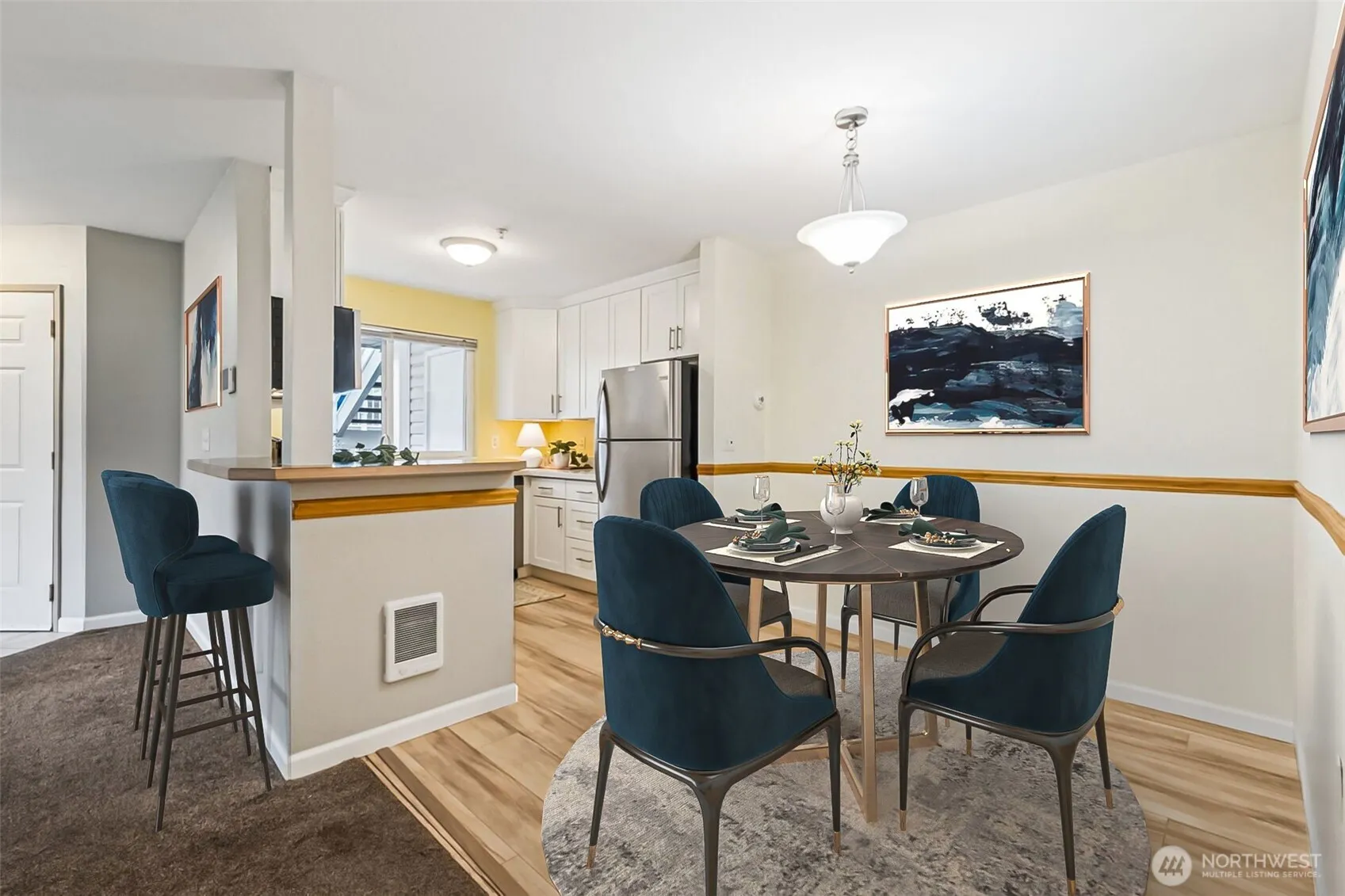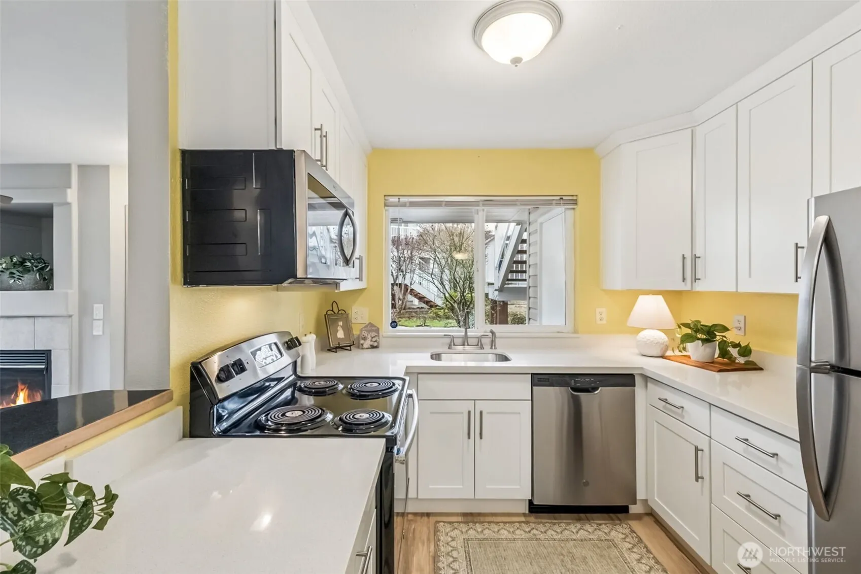 Windsong Arbor Condominium on Kent East Hill is Move-In Ready with MOTIVATED Sellers! A beautifully updated ground floor, 1 bedroom corner Unit that offers lots of light and views to beautiful trees and landscape surrounds in a gated community, Must See to appreciate. Enjoy the bright spacious living room with a cozy gas fireplace, a cheery kitchen with window over the sink, pretty white cabinetry, soft close & pull-out shelving & drawers, quartz counters & newer flooring. All appliances stay (incl washer & dryer). The oversized bedroom has 2 spacious closets and lots of room for dressers or other furniture. Parking includes 2 spots, one assigned carport plus one uncovered space. A handy exterior storage closet is off the sweet front porch and set amongst beautiful, mature landscaping. Enjoy Community Amenities, incl. clubhouse with exercise room, gathering area, sports courts & pet Park. Location, location…all in great proximity and access to freeways with walkability to shopping, restaurants & gym a few blocks away. Seller will pay 3 mos HOD dues and paying off current HOA assessment at Closing. Must See! (Living, Dining & Bedroom Virtually Staged).