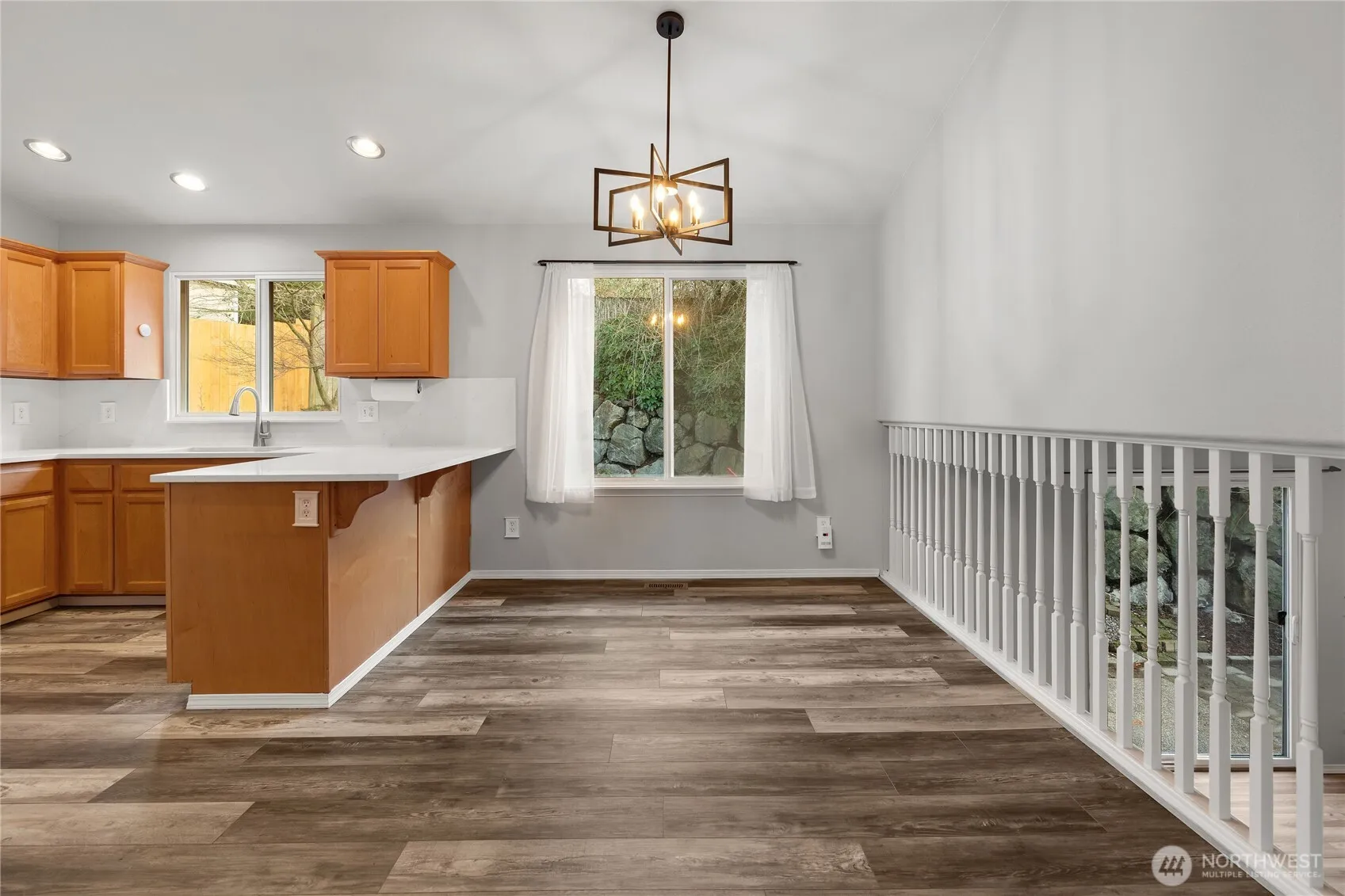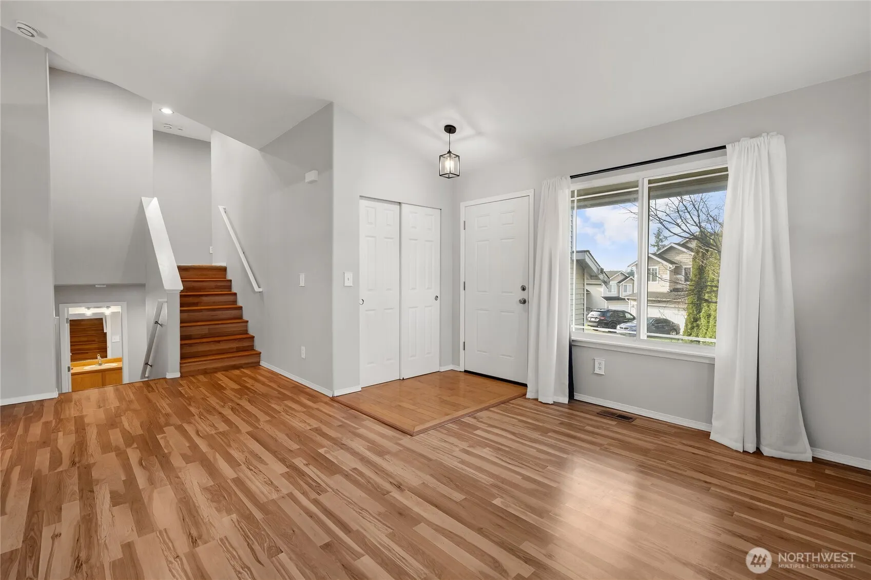 Tucked away in the quiet Woodbridge community, this well-maintained home offers ample space and privacy. The open floor plan features a kitchen with stainless steel appliances, a walk-in pantry, and an adjacent dining area that flows effortlessly into the main living space. Downstairs, a cozy rec room with a gas fireplace and convenient half bath provides easy access to both the backyard and the attached garage. Upstairs, the spacious primary suite features vaulted ceilings, two closets, and a private full bath, complemented by two additional bedrooms, a full guest bath, and a convenient laundry closet. Enjoy recent updates such as the 2024 two-stage furnace, AC, and new light fixtures throughout. Close to shopping, dining, and I-5.