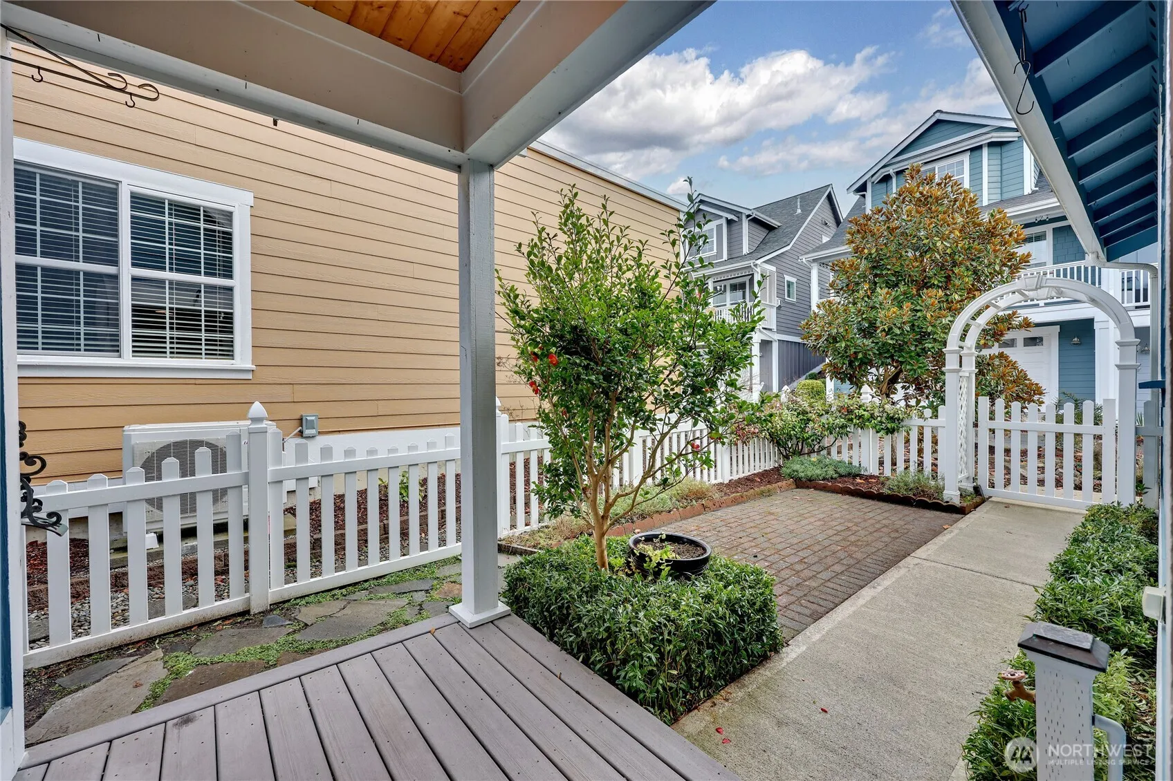 Experience easy living in Poulsbo Place. Enjoy the nearby shoreline, local shops, cozy cafés, bakeries and nearby marina. Inside, the home offers a comfortable living room with cozy gas fireplace, engineered hardwoods, and a kitchen with pantry. The main-floor primary bedroom includes a private bath with laundry close by. Upstairs are two spacious bedrooms with a full bath and large walk-in closets. A two-car rear entry garage located in the alley. The back yard has an attractive courtyard that is fenced and gated that completes this inviting home. Lawn care is handled year-round by the HOA for $125/month.