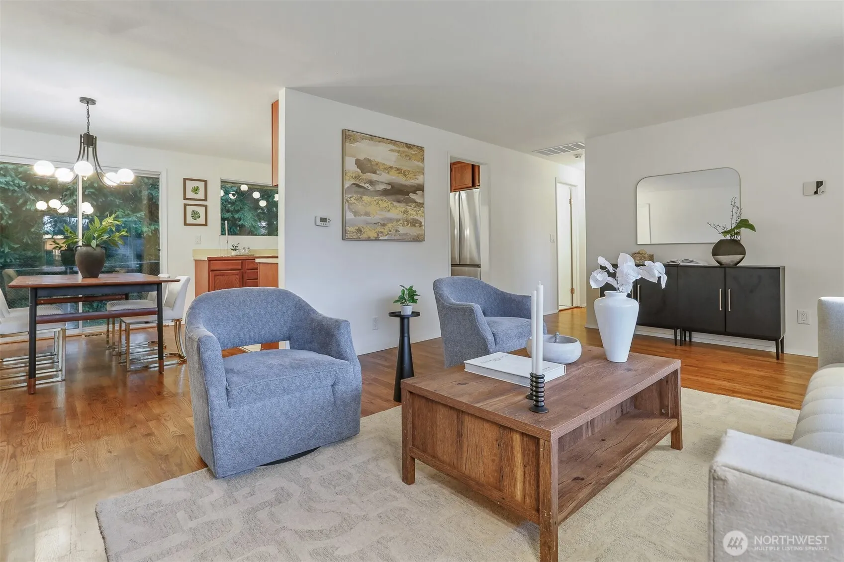 Wonderful MLT Rambler on a quiet, tree-lined cul-de-sac. Covered entry opens to a light-filled living room with refinished hardwoods, brick wood-burning FP, and large picture windows. Refreshed kitchen offers ample cabinets, new vinyl flooring, fresh paint, and stainless appliances. Dining room off kitchen features new designer lighting, a large pantry closet, and slider to the private yard. Hall bath includes new tub enclosure, quartz vanity, and updated fixtures. Largest bedroom has a spacious closet and forest views. One-car garage provides utility space and extra storage. Fully fenced yard with patio, shed, and fire pit.