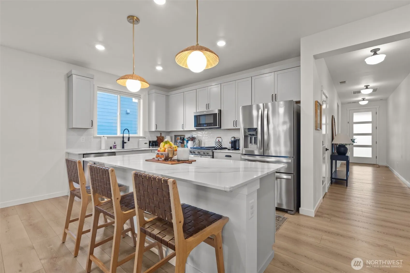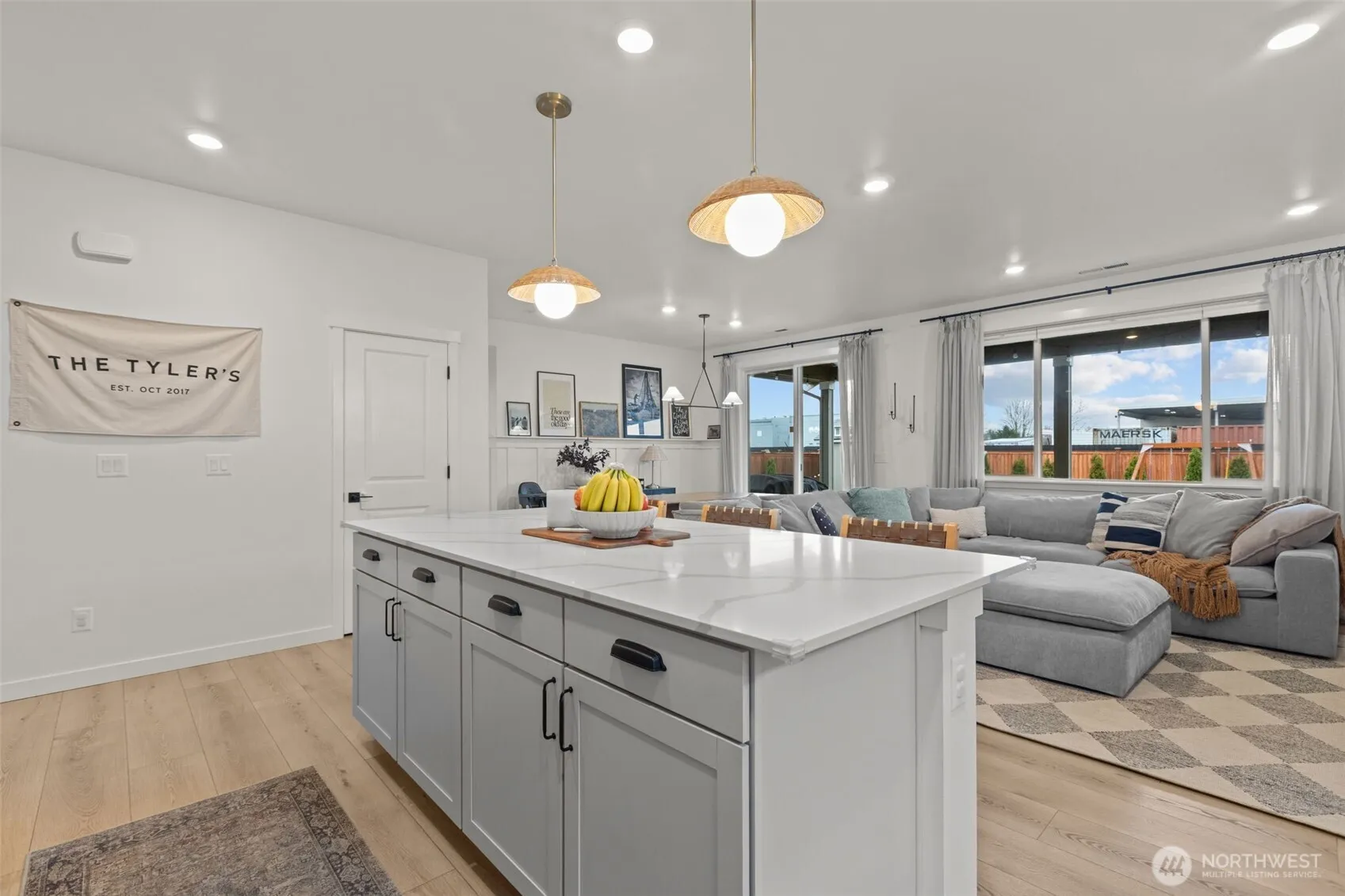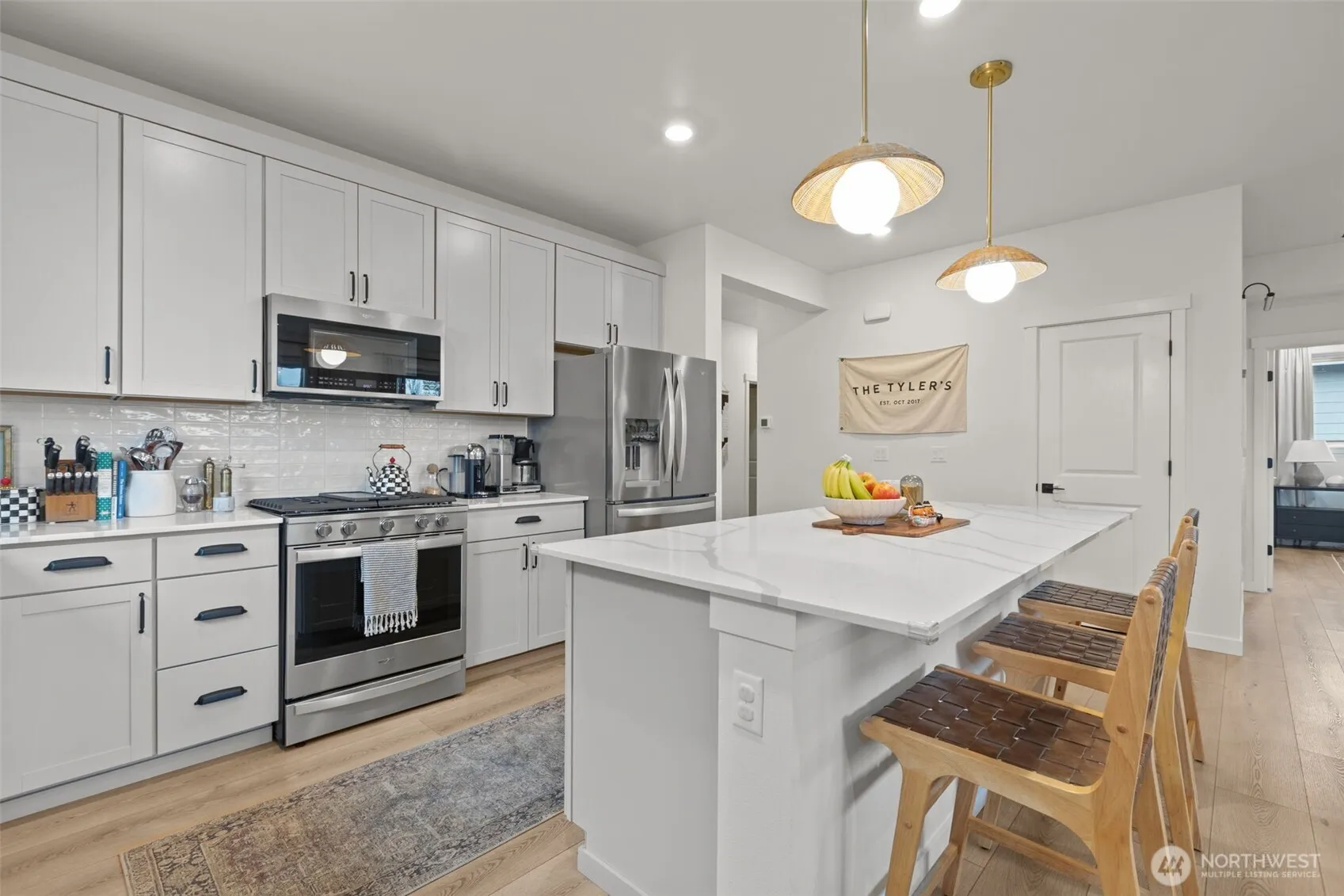 Welcome home to Alder Brook! This spacious rambler offers 3 bedrooms, 2 bathrooms, and a versatile den/office. Thoughtfully designed, it features a beautiful primary bedroom suite, an extended covered patio, 9 ft. ceilings, and a cozy gas fireplace. You’ll love the designer finishes throughout—tile flooring in both bathrooms and the laundry room, plus stunning oak luxury vinyl plank in the main living areas. The kitchen stands out with 42” full-overlay cabinets, a full tile backsplash, sleek quartz countertops, and a gas range. Enjoy southern exposure for added natural light and mountain views. Close to downtown Enumclaw for convenient shopping or an evening out.