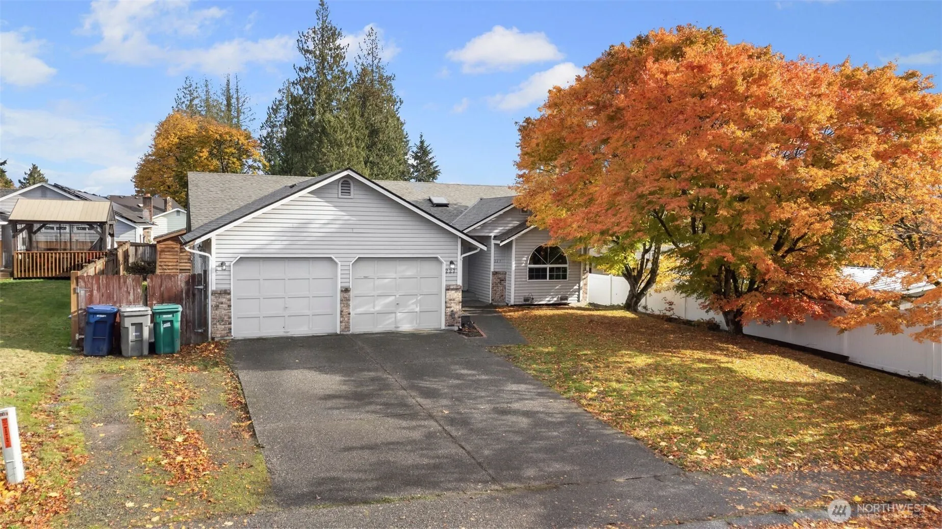 Welcome to this conveniently located rambler in Lake Stevens close to Target & Davies Beach. This inviting 1,418 sq ft rambler offers an open living space. Find custom updated bathrooms, finished bonus room, vaulted ceilings, natural light, & a cozy pellet stove in the spacious family room. The kitchen features an eating bar & is open to the dining area, which leads directly out to the entertainment-sized back deck & a fully fenced yard with a garden shed! You’ll appreciate the practical features, including a new water heater, two-car attached garage and plenty of parking. With all appliances included plus a great layout, this home is move-in ready.This is an exceptional opportunity to own a charming home in a great location. New roof 11/25
