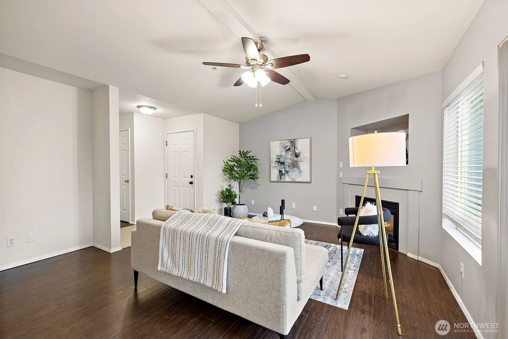 Welcome to Sunrise at Benson, a gated condo community in Kent. This inviting 2-bedroom, 1-bath home features well-designed living space with a cozy gas fireplace. Enjoy your private deck with serene tree views and an updated kitchen with white cabinets and a breakfast bar—ideal for casual dining or entertaining. Includes a private detached 1-car garage plus ample guest parking. HOA dues cover water, sewer, garbage, and common area maintenance. FHA approved with no rental cap. Conveniently located near SR-515, shopping, dining, and public transit. Don’t miss it!