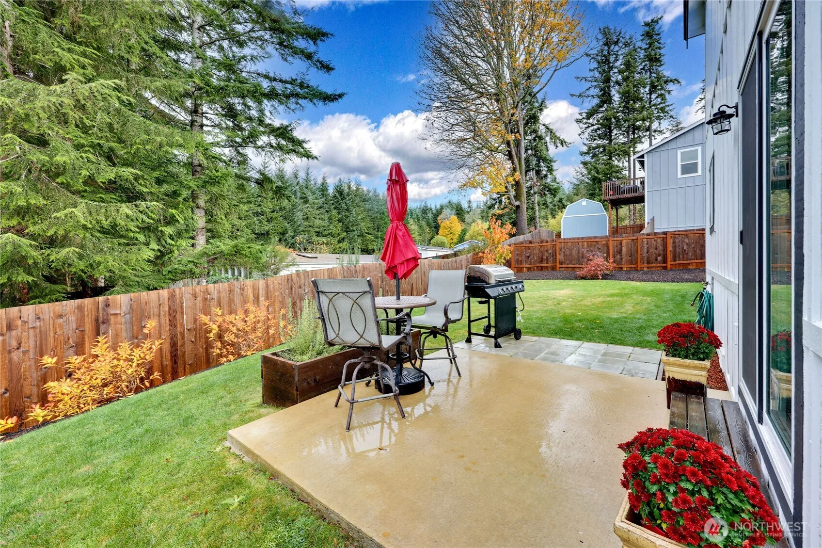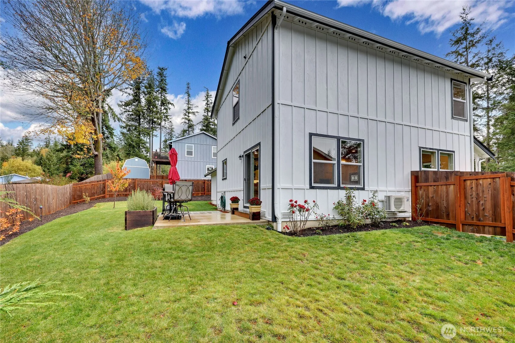 Nearly new and lightly lived in, Farm Style Home. The covered front porch has been freshly stained, easy to maintain landscaping offers a kaleidoscope of seasonal color. Inside, the main floor features durable LVP flooring and an open layout that works for everyday living. Mini split for A/C throughout the summer months. Peak-a-boo views of Hood Canal. The kitchen offers quartz counters, white cabinetry, & dining area that opens to the fully fenced backyard. All three bedrooms are upstairs, primary with en-suite bath & walk-in closet. Attached two-car garage. Trails end offers optional Community Beach Access, but no restrictive HOA! Minutes to Hwy 104 & the Hood Canal Bridge. A comfortable, move-in-ready place to Call Home!