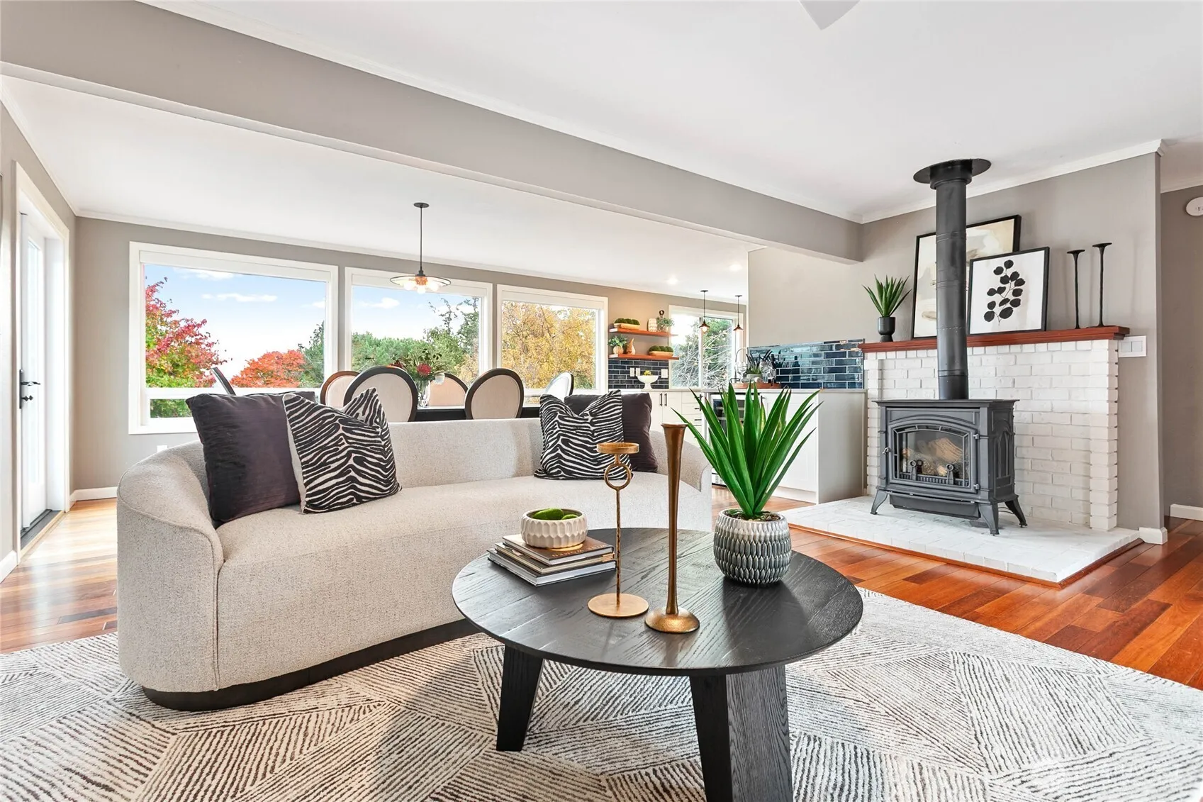 Beautifully cared-for Skyline home with water and mountain views! Move-in ready featuring a bright, well-designed kitchen that flows into the dining/living area. Multiple bonus spaces: den/office w/ built-ins, relaxing solarium w/ hot tub, 360 sf heated gym and workshop, plus generous storage room. Two fireplaces, hardwoods, skylights, designer lighting, and upgraded window treatments. Downstairs offers modern tile flooring, spa-like ¾ bath w/ radiant floor heat & family room opening to a secluded, fenced backyard. Enjoy front deck sunsets, unwind on the back deck, or entertain on the patio. Ample parking, carport & RV space. Located within walking distance to Washington Park and local amenities (sports courts, playground, marina, beaches).