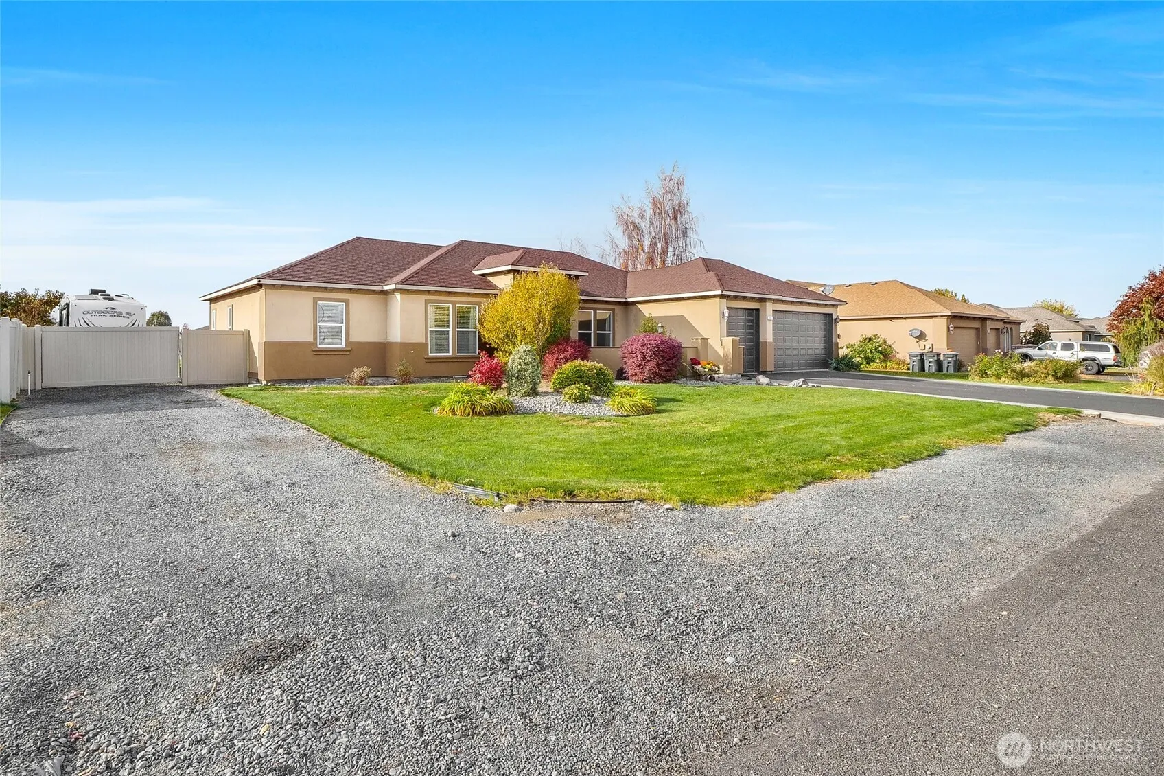 Welcome to your private sanctuary! This stunning 3-bedroom, 2.5-bathroom stucco home is nestled on over 1/2 an acre of beautifully landscaped land, offering ample space for both relaxation and entertainment. Step inside, and you’ll discover a spacious and inviting layout that brings practicality and comfort together. The well-appointed kitchen features modern fixtures and provides a perfect space for gatherings. Along with the generous 3-car garage, you’ll find ample parking options and designated RV space, allowing for endless possibilities for your vehicles and recreational toys. Don’t miss out on this rare opportunity to own a beautiful home with incredible outdoor amenities in a peaceful setting.