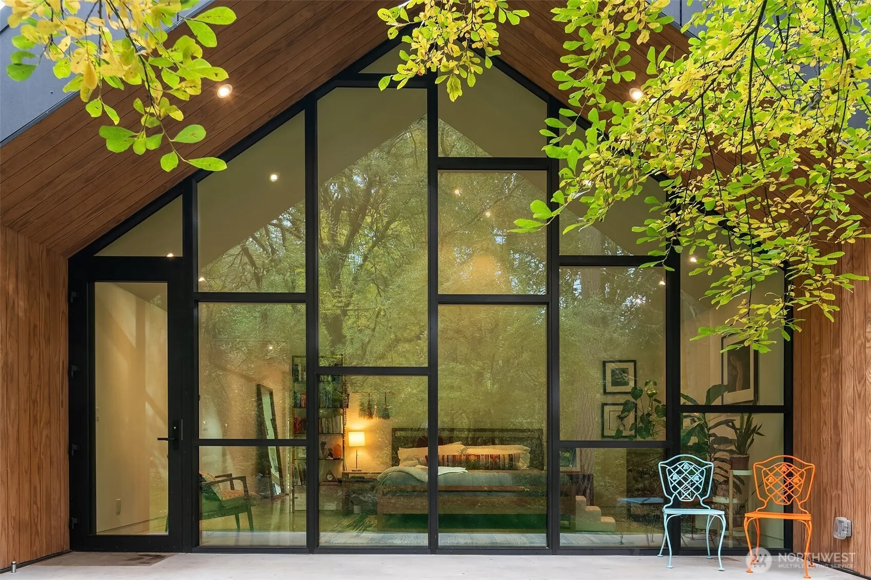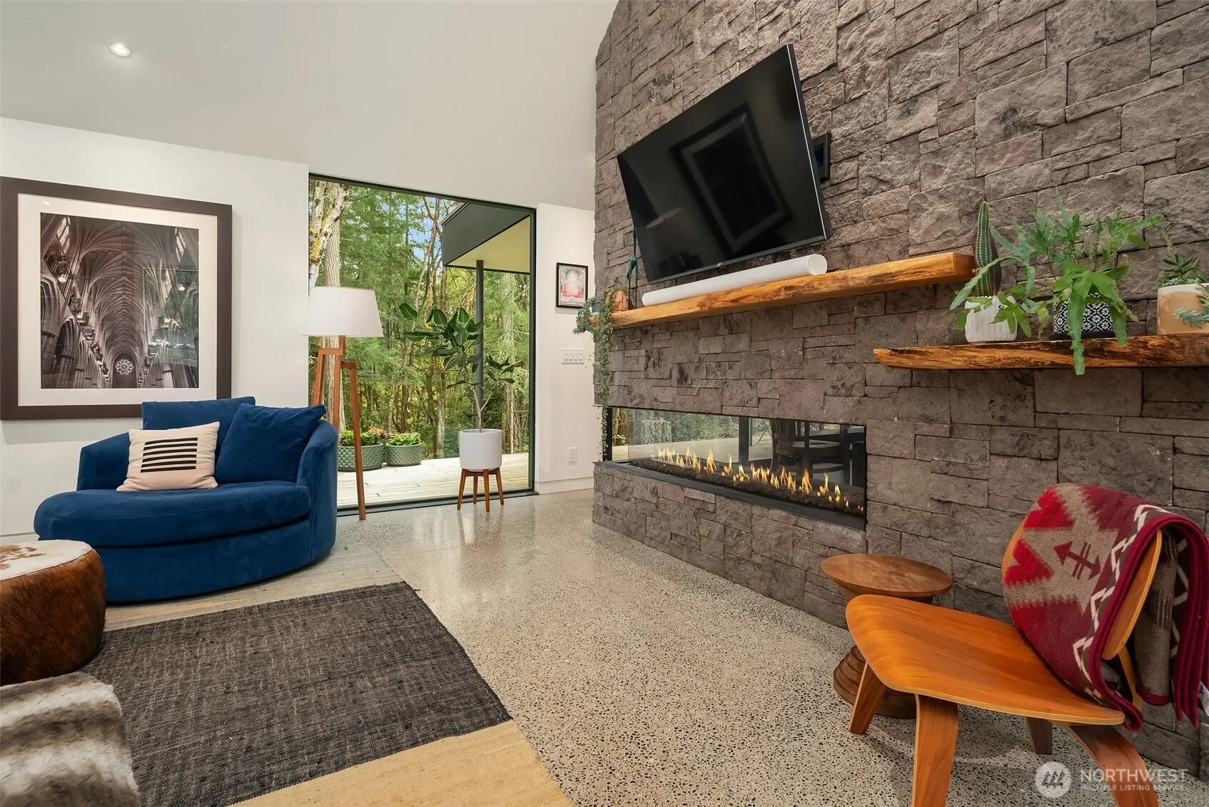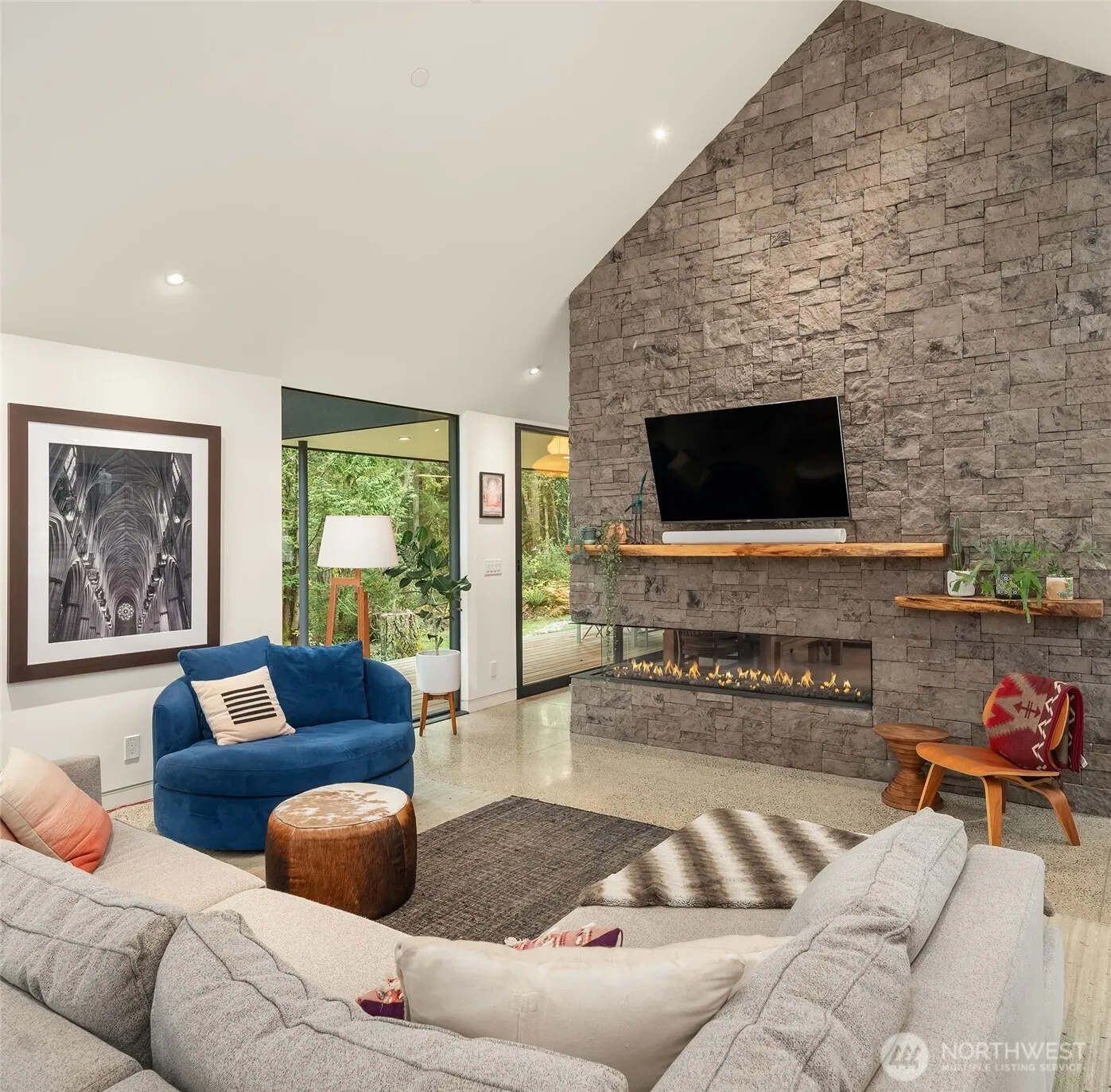 Welcome to Nordic Casa, a 2023 modern masterpiece by acclaimed architects from Specht Novak. Step inside and feel the effortless flow of a welcoming retreat where open-concept design connects every space with intention – blending warmth, function, and artistry. Dramatic vaulted ceilings and polished concrete heated floors, anchored by a striking 3-sided fireplace. Custom white-oak cabinetry and quartz countertops reflect natural elegance, while tropical hardwood decks and covered patios blur the line between home and forest. Impressive curtain walls and floor-to-ceiling windows frame madrone views and starlit skies. Smart lighting, built-in office, flexible bonus space—just minutes to town, schools and KVI, yet a world apart in tranquility.