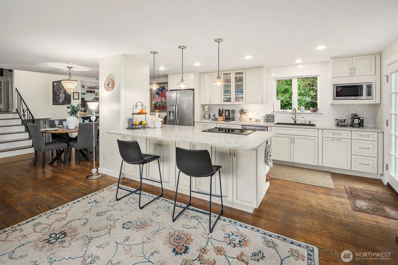 Framed by a classic white picket fence near Yost Park, this tri-level blends modern updates with effortless Edmonds living. Chef’s kitchen impresses with slabs of granite, sleek cabinetry, and generous prep space—bright, functional, and open to the great room. Built-ins add warmth and style, from the dining room display to the California Closets. French doors off kitchen spill out to sun-drenched brick patio and a huge backyard prime for entertaining. Brand new roof adds peace of mind. Three bedrooms plus updated full bath upstairs, while mid-level features a flexible bonus room with a private hot tub and sauna. Lower level adds potential 4th bedroom and ¾ bath. Nearly 2,000 sq.ft. on an 8,276 sq.ft. lot—style, comfort, and pure serenity.