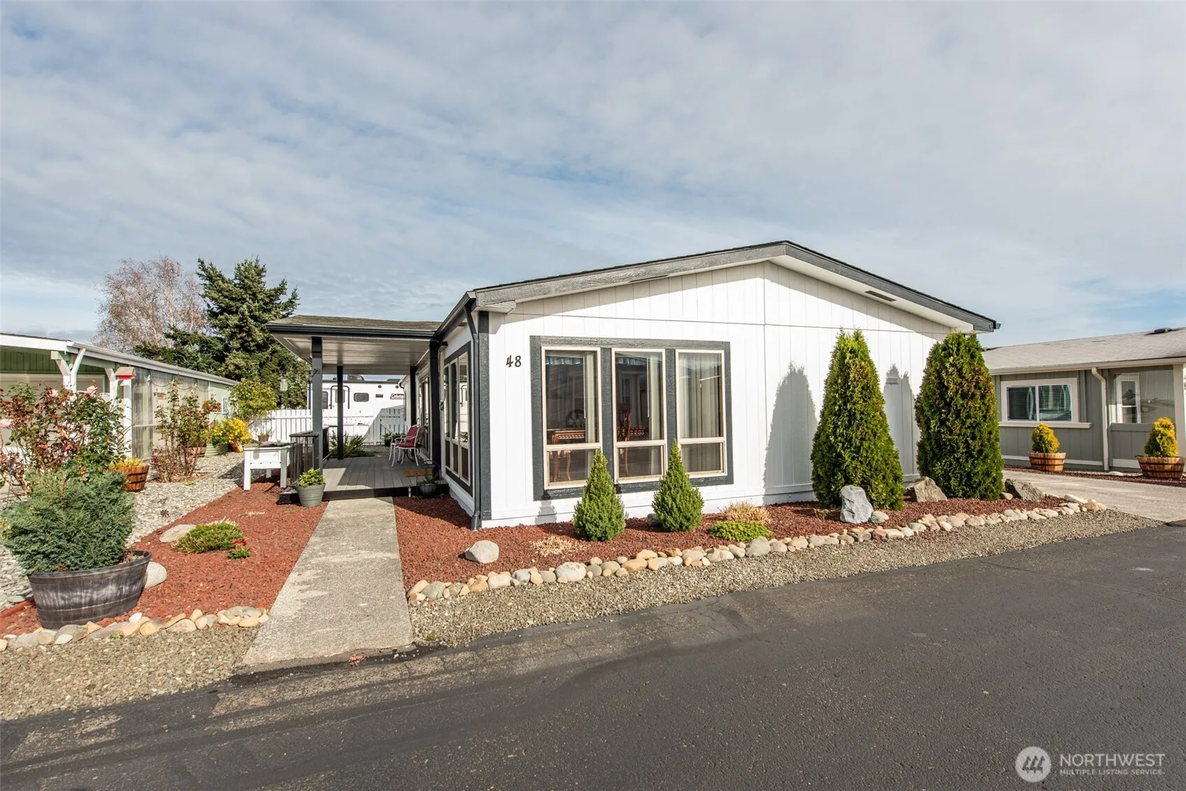 Enjoy easy in-town living at West Alder Estates, one of Sequim’s most walkable 55+ communities! This well-maintained 1,614 sq ft home features an open layout with updated laminate flooring, vaulted ceilings, and skylights. Offers 3 bedrooms, 2 baths, a spacious kitchen, and a large covered patio for outdoor relaxation. Fresh exterior paint adds great curb appeal, and the low-maintenance yard means more time to enjoy the town. Located just blocks from shopping, dining, medical services, and parks—this home truly combines comfort, convenience, and walkability! This home borders the alley, providing added convenience and parking.