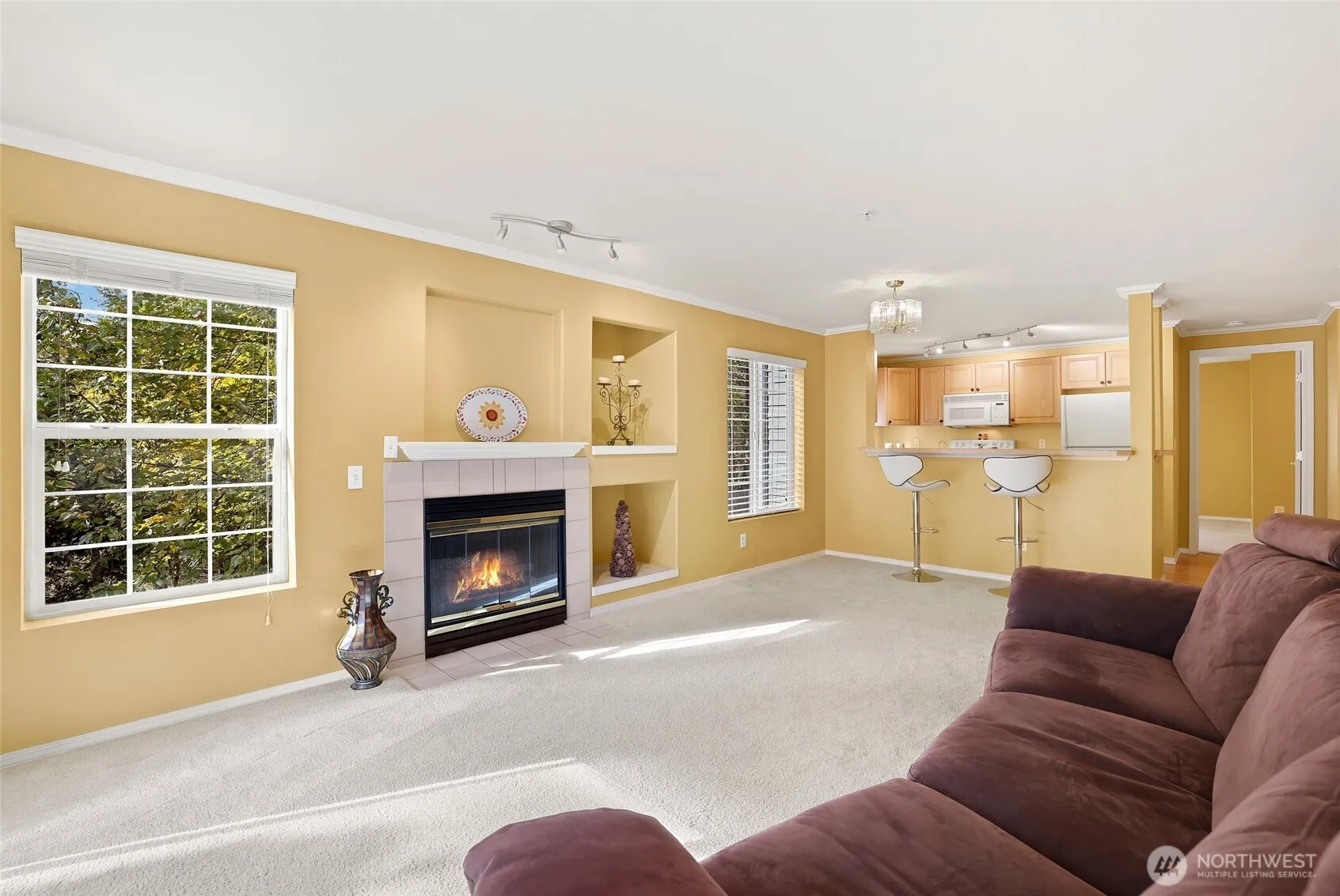 Beautifully maintained 2-bed, 2-bath end unit is bathed in natural light from the south and west. A large gas fireplace anchors the open-concept living area, with dimmers to set the perfect ambiance. Enjoy newer paint, carpet, and serene woodland views. The private balcony offers storage, plus a new high-quality water filtration system and water heater. The spacious primary suite features dual closets and an ensuite. The second bedroom overlooks the pond and fountain with dual closets. Designated carport and generous guest parking. HOA covers water, sewer, gas, and trash. Community amenities include a gym, clubhouse, and park. Walk to Trader Joe’s, dining, and more, with easy access to Lake Meridian trails, Kent Station, and Hwys 18 & 167.