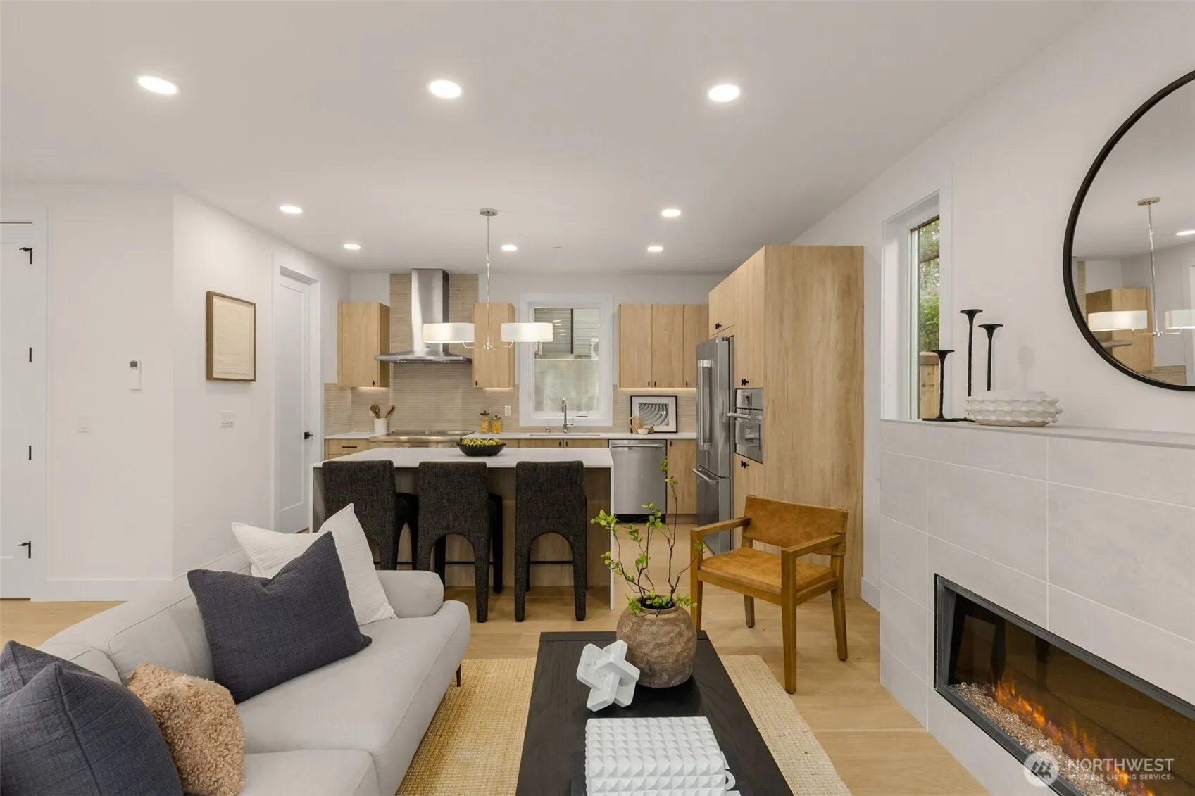 Introducing an exceptional new construction home by Revolution Custom Builders, thoughtfully designed with timeless style and modern comfort in one of Kirkland’s most convenient locations. This beautifully crafted residence showcases high-quality finishes, intentional design, & a functional floor plan ideal for today’s lifestyle. The main level features a light-filled great room anchored by a statement fireplace, seamlessly flowing into the chef-inspired kitchen with a spacious island, premium appliances, & generous workspace; perfect for entertaining or everyday living. Large windows and sliding doors invite natural light and connect the interior living spaces to a private outdoor patio, creating an effortless indoor-outdoor experience. A welcoming covered front porch, elegant entry, & main-level powder room complete the thoughtfully designed first floor. Upstairs, the primary suite offers a serene retreat with a spacious walk-in closet and a beautifully appointed ensuite bath. 2 additional bedrooms, full bath, & upstairs laundry provide flexibility & functionality. Enjoy easy access to some of Kirkland’s most sought-after amenities. 2 designated EV-ready parking spots. Just minutes away are Juanita Village, Totem Lake Village, & DT Kirkland, offering dining, shopping, and entertainment. Outdoor recreation is abundant with nearby Juanita Beach Park, St. Edward State Park, & waterfront trails. Convenient access to I-405 makes commuting to Bellevue & Seattle.