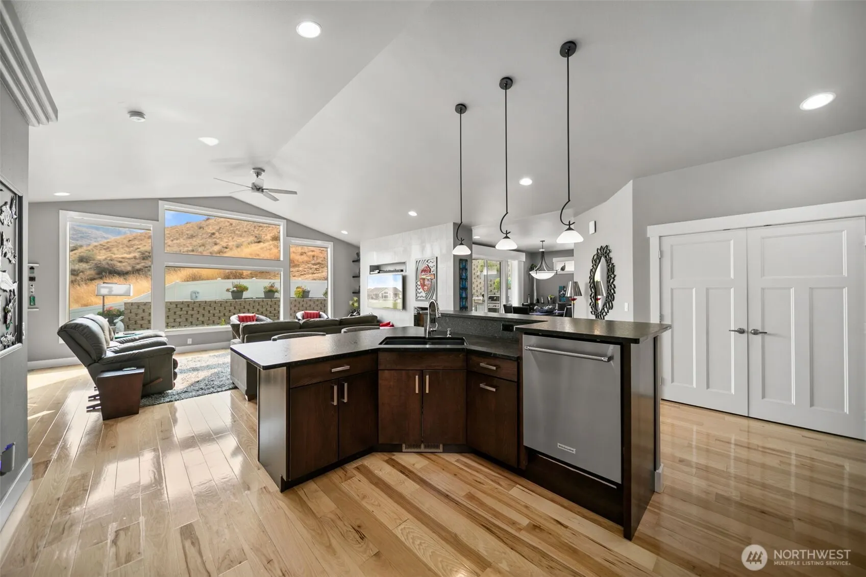 Experience the perfect blend of comfort and sophistication in this impeccably designed zero-entry rambler with breathtaking views and high-end finishes throughout. Move-in ready and thoughtfully crafted, this home features solid hardwood floors, vaulted ceilings, and an open-concept layout filled with natural light. The gourmet kitchen showcases leathered granite countertops, premium cabinetry, & top-tier appliances. Entertain in the formal dining area with a built-in buffet. Enjoy the spa-like primary suite with heated tile floors and serene views. Multiple outdoor living spaces and a 3-car garage with tandem bay add flexibility and function. A rare opportunity for low-maintenance, luxury living with timeless design and modern comfort.