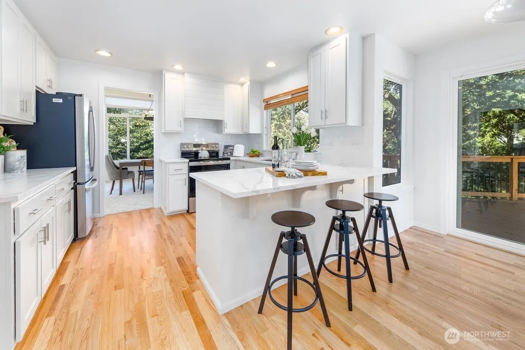 Beautifully updated North Bend home in highly coveted Forster Woods neighborhood! Newly remodeled kitchen features quartz counters, breakfast bar, new appls, & stylish finishes. Refinished hardwoods, new paint & carpet thru-out, plus fully remodeled bathrooms. Luxurious primary suite offers soaking tub & custom enclosed glass shower + walk in closet. Great rm w/ cozy fireplace opens to deck & has a built in workspace. Formal dining area off living rm —ideal for gatherings 3 bedrooms + den & 2.5 baths provide flexible living. Outdoor living shines w/ new TimberTech deck, sweeping Mt. Si views, custom landscaping, new fence, new Hardi plank siding & new roof. Close to trails, parks, & year-round recreation —move-in ready & stunning!