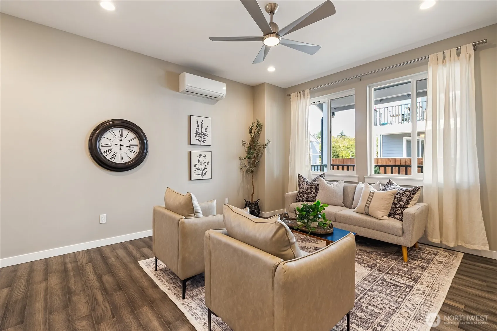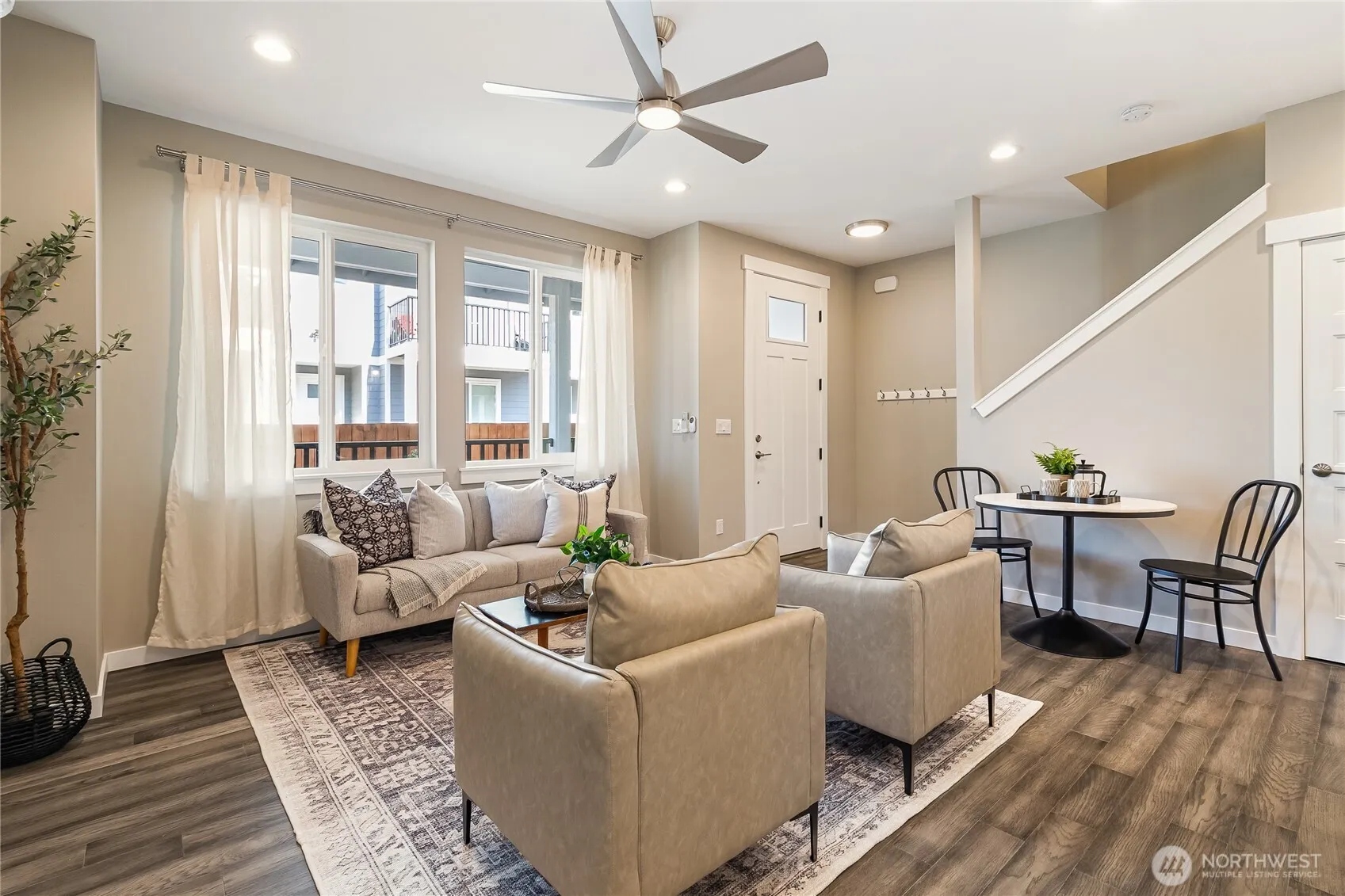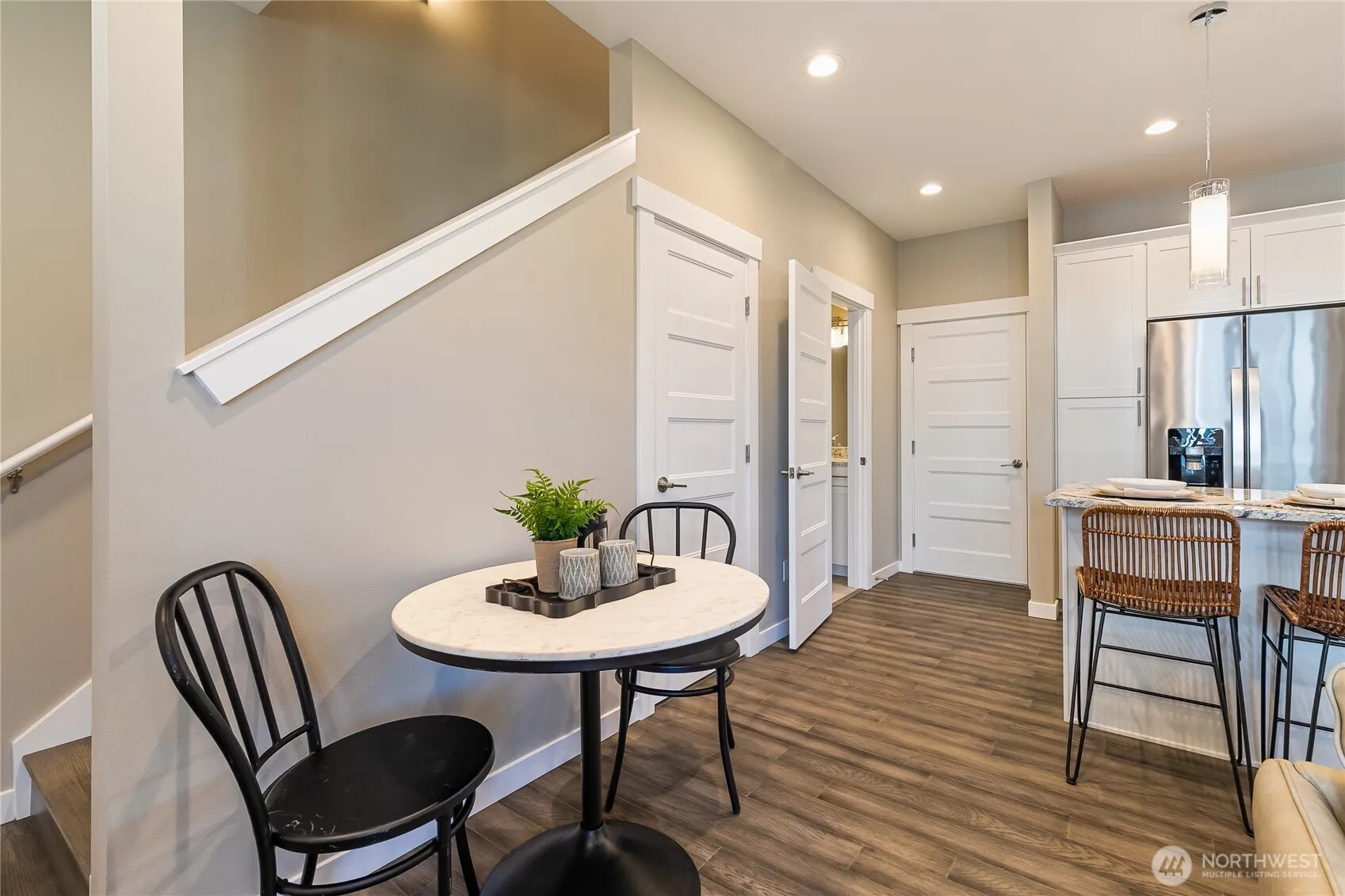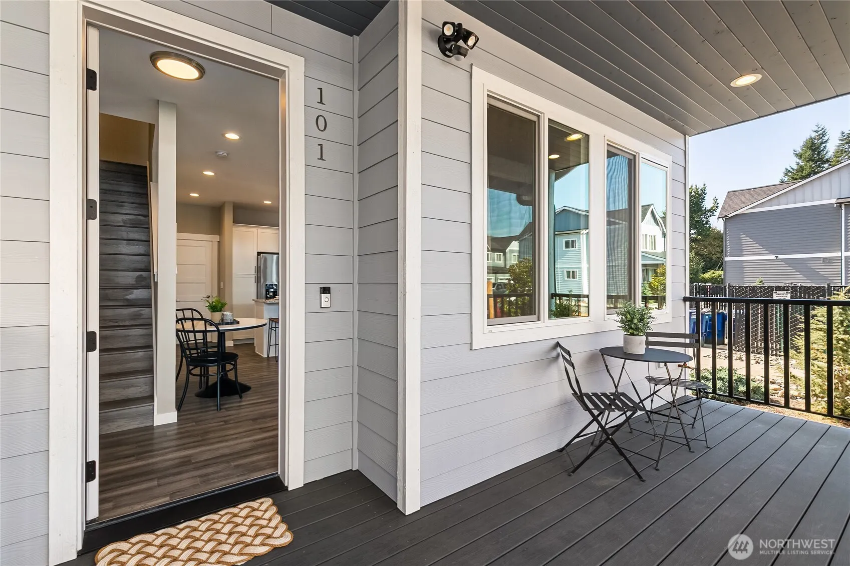 Step into a perfect blend of Modern Living & Elegant Details! This immaculate two-year old end-unit townhome features 2 spacious bedrooms, 2.5 baths & a versatile office/flex space. The home is filled w/thoughtful upgrades—granite countertops, under-cabinet kitchen lighting, smart switches, Ring door cam, timeless flooring, stainless steel appliances, & mini-split heat pump with A/C. 9’ ceilings enhance the bright, openness throughout. With a spa-inspired primary bathroom, the walk-in shower ‘wows’ w/dual shower heads surrounded in designer tile & double sink vanity. Access your own 2-car garage from the kitchen: a rare find. Located in Ferndale’s newest condominium community bordered by greenspace; it’s just minutes to downtown and I-5.