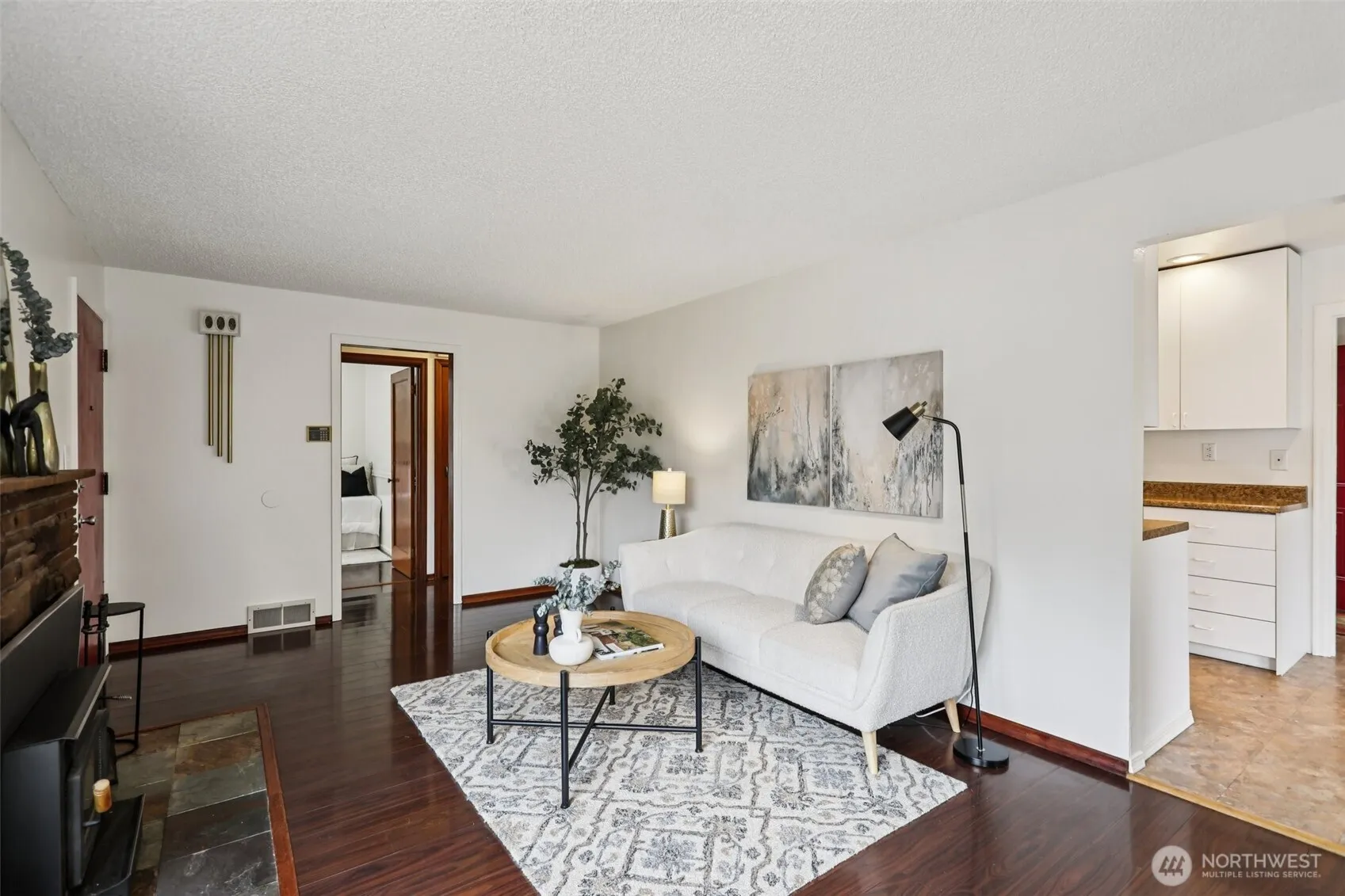 Super sweet home full of light & charm! Step inside to open living & dining room w/large floor-to-ceiling windows that fill the space w/natural light. A cozy fireplace w/insert, laminate flooring & access to the front deck create the perfect spot to relax or entertain. The dining area opens to a bright kitchen featuring plenty of cabinetry & counter space. A backdoor leads to the massive backyard—complete with a covered patio & firepit for year-round enjoyment! Both bedrooms feature charming corner, wood-wrapped windows. Fresh interior paint throughout. The garage offers a new door/remote & ample storage. Fantastic location! Close to Southcenter Mall, theaters, restaurants & more. Easy commute w/access to I-5, 405, or the light rail.