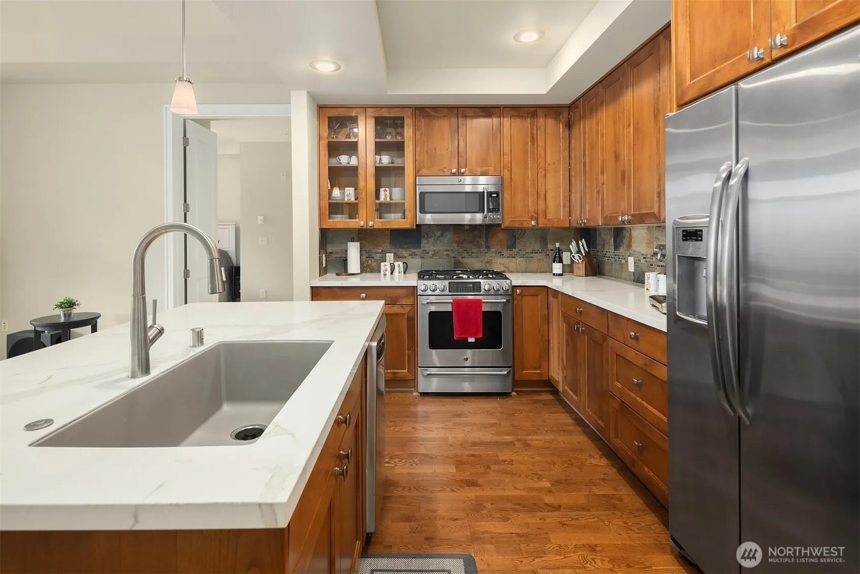 Experience refined living at The Fairview, perfectly positioned beside Harbour Pointe Golf Club with effortless access to everything Mukilteo has to offer. This 2-bedroom, 1.75-bath residence showcases a tastefully updated kitchen, fresh interior paint, brand-new carpet, abundant storage, and a versatile flex/office space with recently added built-ins. The spacious primary suite offers a private bath, walk-in closet, and patio access where seasonal peek-a-boo views of Puget Sound can be enjoyed. Building amenities include a fitness center, community clubroom, peaceful courtyard with fountains and BBQ, secure lobby, and elevator access—no stairs required! This unit comes with TWO walk in storage units and TWO covered garage parking spots.