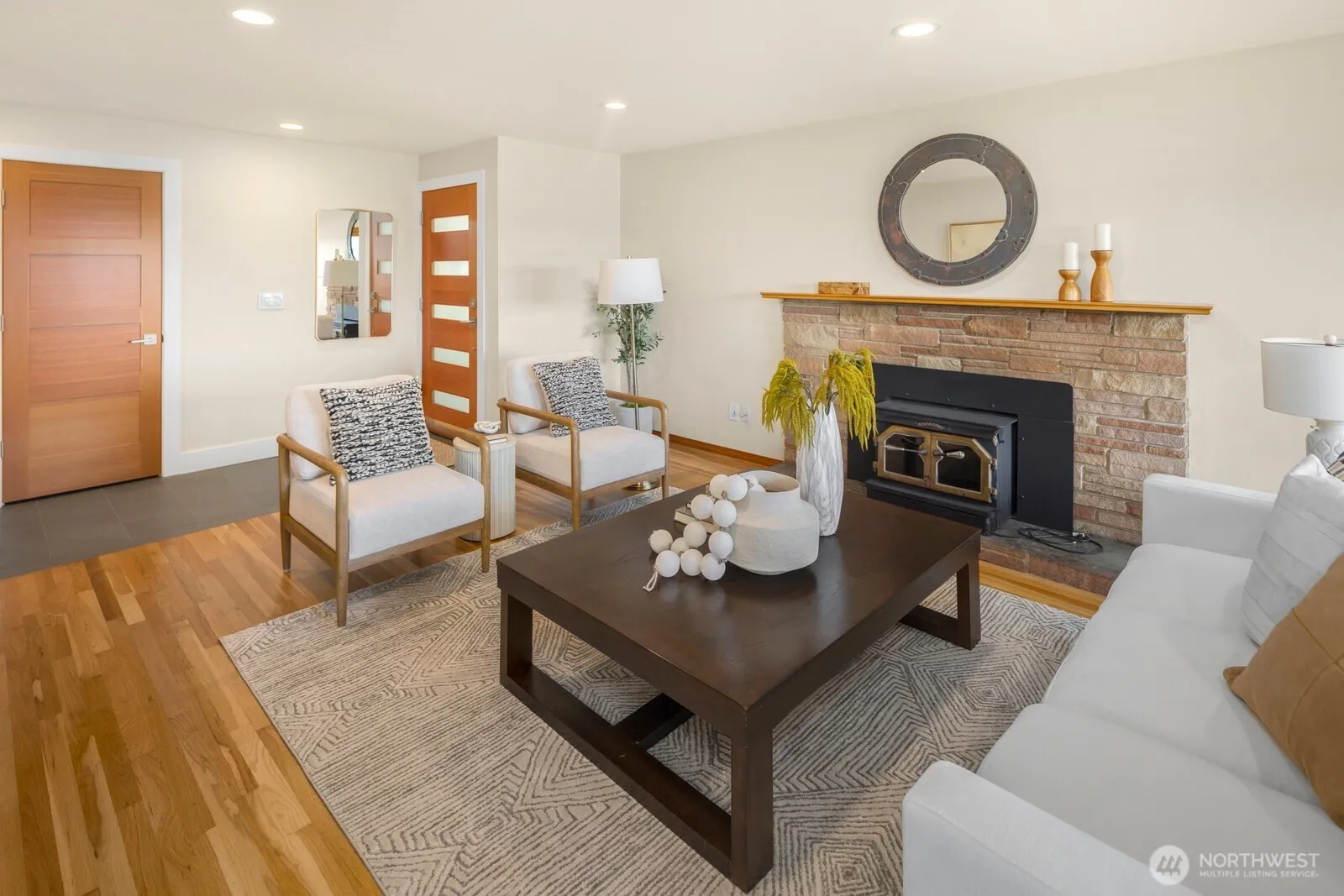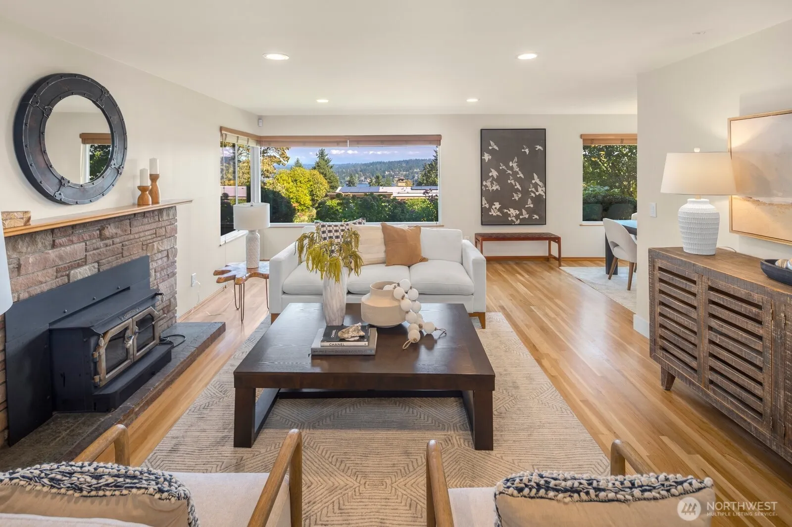 This beautifully renovated mid-century rambler, w/commanding corner location & Lake Washington & Cascade views will capture your heart. Level entry to gracious living spaces w/rich hardwood flrs & large picture windows to frame views. Entertain friends in the large dining rm as you create your latest culinary feat in a stunning new kitchen. Thoughtfully designed & executed reno boasts alder cabinets, built-in pantry, gorgeous brushed granite counters & textural tile backsplash. Primary suite w/3/4 BA, 2 add’l BRs & remodeled full BA. Large family/rec rm will be your fav new hangout – great flex space for work & play. Big fenced yard w/room to run, patios to entertain & sweet shed for storage/studio. Central A/C. Just minutes to LFP Town Ctr