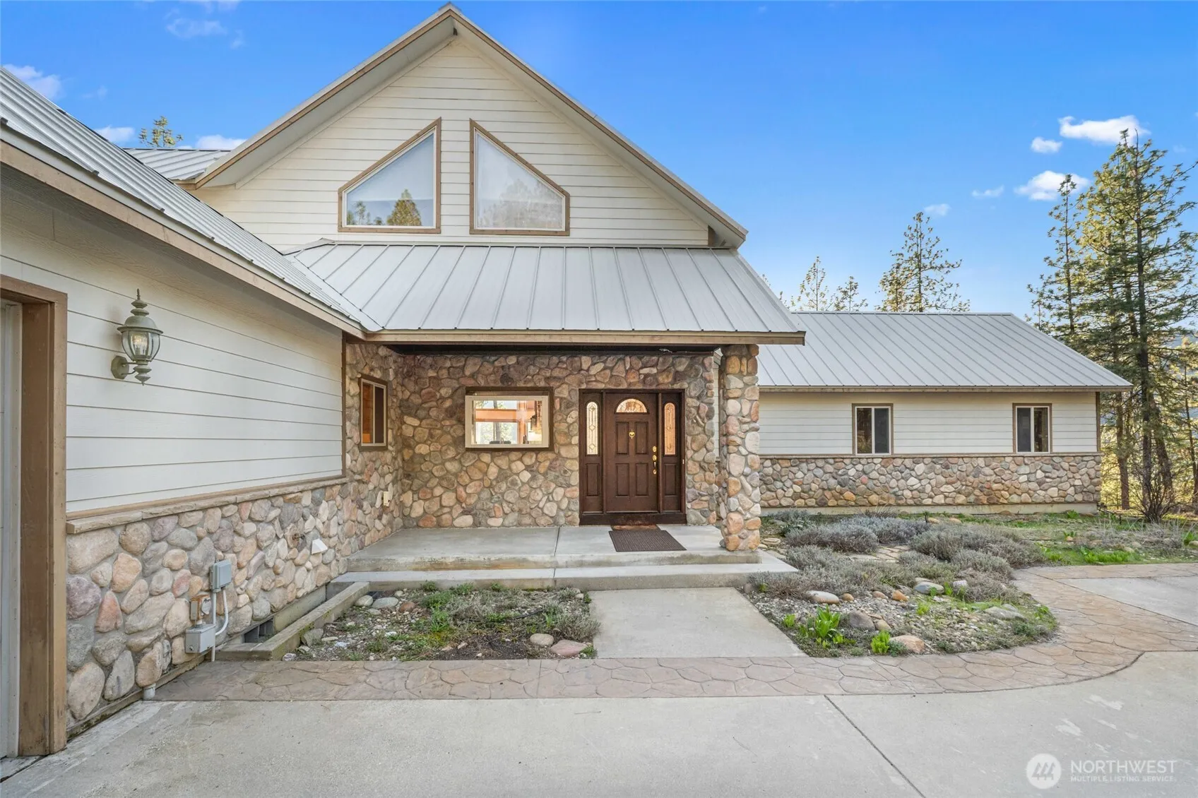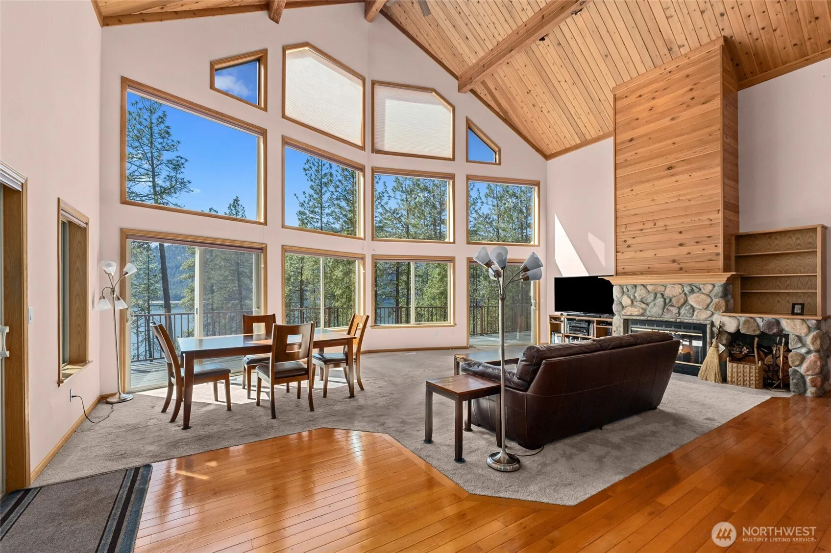 Whether it is from the large west facing deck or the gazebo that overlooks Lake Roosevelt, your heart will soar watching eagles & listening to the wind through the pines at this incredible home on 9 acres w/400′ of Lake Roosevelt gov. frontage. Well built & thoughtfully laid out, this magnificent home features a main floor primary bedroom suite w/jetted tub, cedar lined walk in closet, a towering main floor great room w/a wood burning FP & abundant windows allowing in lots of light no matter what the season, loft, separate laundry room, 1/2 bath on main & a cozy sunroom w/access to the deck. The finished walkout basement has a large LR, 2 bedrooms, full BA, large mechanical room & pantry. Utilize the clean 3 bay shop for all your toys.