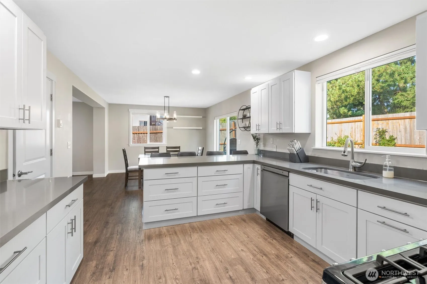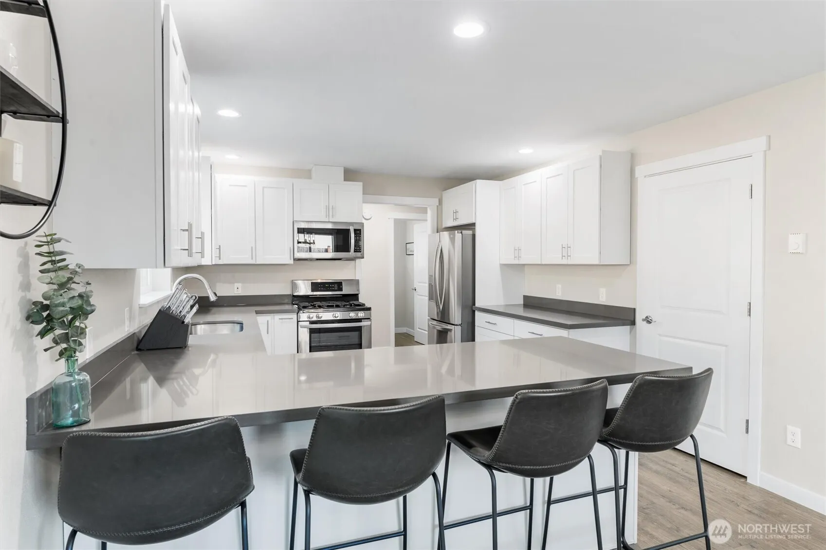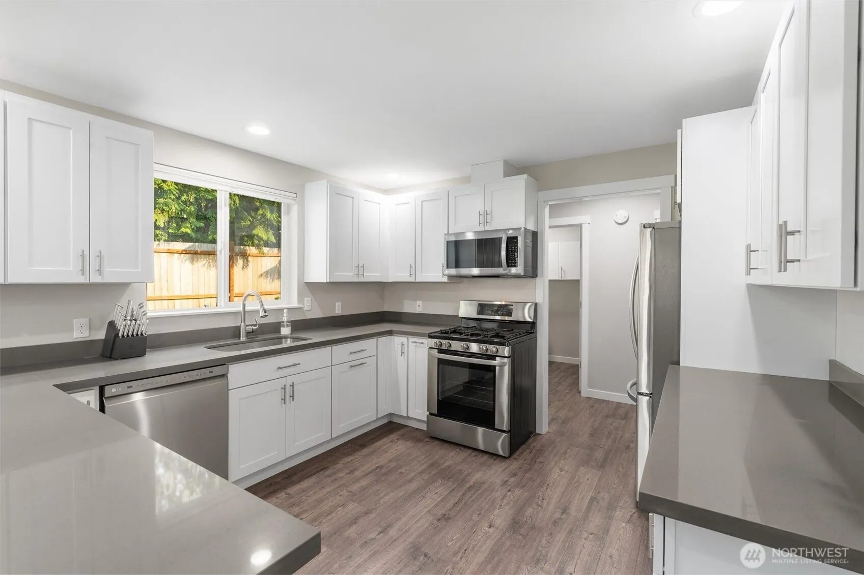 Gorgeous Lake Stevens Home! This light-filled 3 bedroom, 2.5 bath home offers an inviting open floor plan designed for modern living. The kitchen shines with brand-new white cabinetry, quartz counters, and luxury vinyl flooring that flows throughout. Upstairs, spacious bedrooms provide plenty of room to unwind. Step outside to a beautifully landscaped yard with a patio—perfect for summer barbecues or evening relaxation. Ideally located near parks, schools, restaurants, and all the shopping at Frontier Village, with quick access to Hwy 9, Hwy 2, and I-5 for an easy commute.