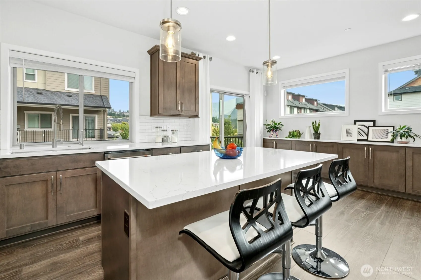 On a coveted corner lot, this end-unit former model home in the Issaquah Highlands combines style, comfort & custom finishes w/ sweeping mountain views. Sunlit interiors showcase designer window treatments & chic accent walls; while the chef’s kitchen w/ quartz counters, Café Series appliances & buffet bar flows to inviting living areas & a covered deck. The lower level offers an office or guest suite w/ a ¾ bath & a patio; while the spacious upper bonus room w/ its own full bath, extends to a rooftop deck that captures glowing sunsets. The primary suite creates a spa-feel retreat w/ an en-suite & walk-in closet. With A/C & close to dining, parks, pickleball & Issaquah Schools, this home offers the best of elevated design w/ close-in ease!