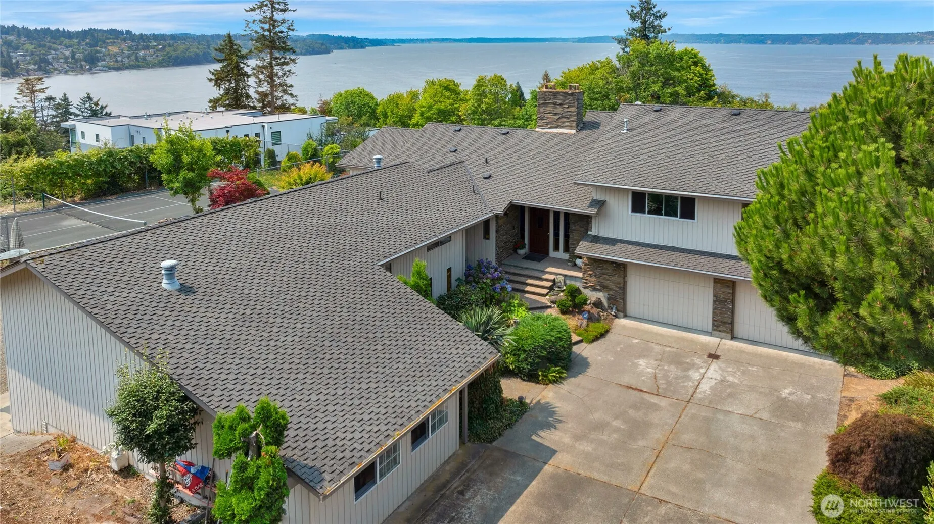 Set on a gated private street of only five residences, this 1.46-acre estate offers a peaceful sanctuary close to town. The ~3,950 sq ft main home features a harmonious layout with expansive areas for entertaining, four bedrooms tucked away, and views of the Sound. Enhancing the grounds are a sport court, circular driveway, and generous space for bespoke landscaping or gardening. The presidential roof (2005) and oak hardwoods (2024) add timeless appeal. Rounding out the estate is a separate ~1330 sq ft 1BR+.75BA guest home complete with a cozy loft and its own parking pad, offering versatility or rental income. Cherished for over 2 decades, this home’s potential stands poised to fulfill its next steward’s vision of their forever home.