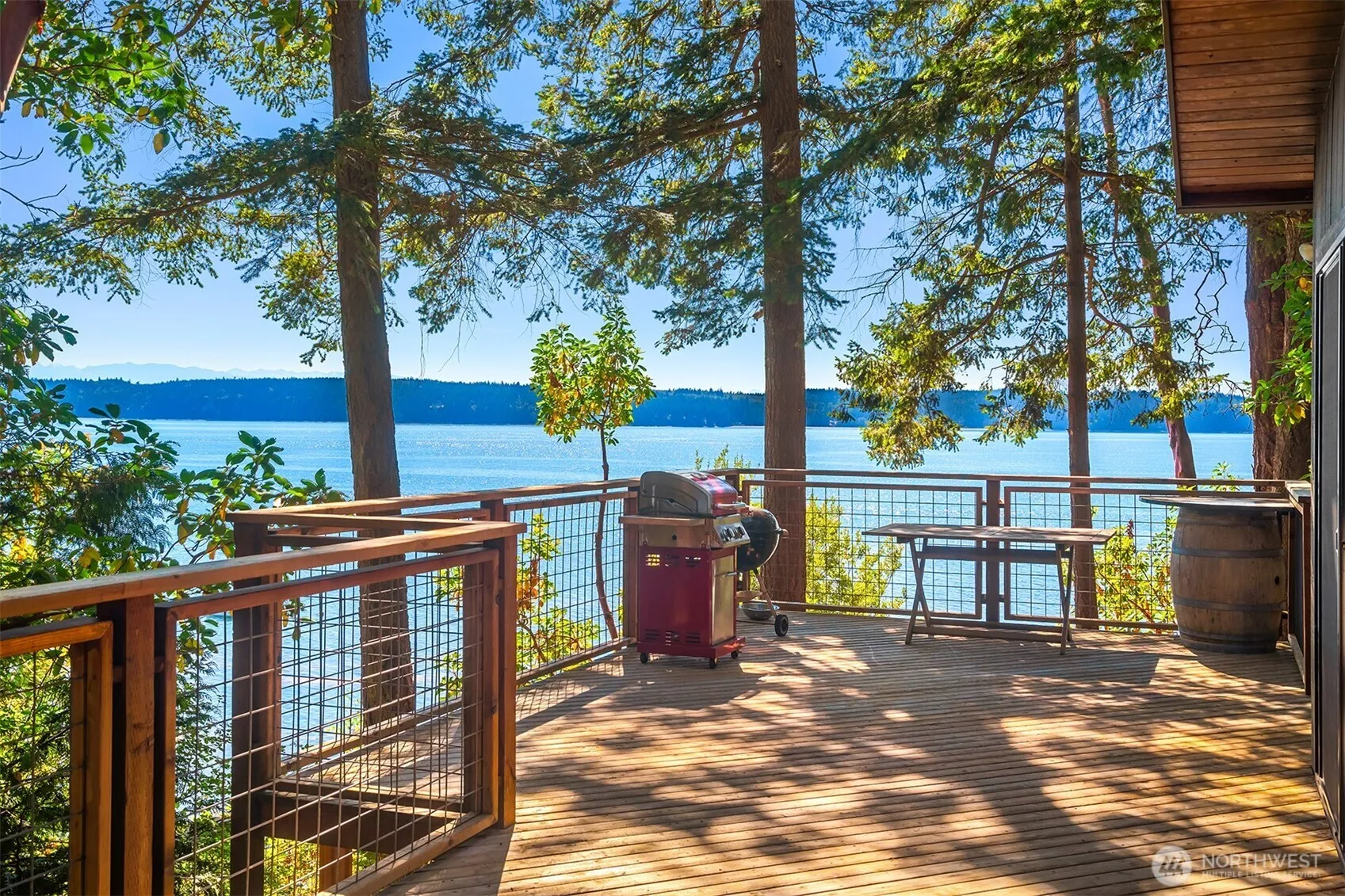 This medium bank waterfront on Camano’s west side has a true retreat feel, with panoramic views of Saratoga Passage, the Olympics, and stunning sunsets. Watch eagles, marine life, and boat traffic. Surrounded by incredible Madrona Trees and shady evergreens, the back lawn paradise offers stone walkways, patios, and a fire-pit. Wood decks off the kitchen and primary suite feature coordinated custom railings. A mid-century modern with signature Camano flair—wood-clad ceilings, warm finishes, and timeless design. Main floor includes primary bedroom, guest room/office, and bath along with living area, fireplace, kitchen and laundry; daylight basement adds family room, two guest rooms, bath, and storage. Easy trail walk to the beach!