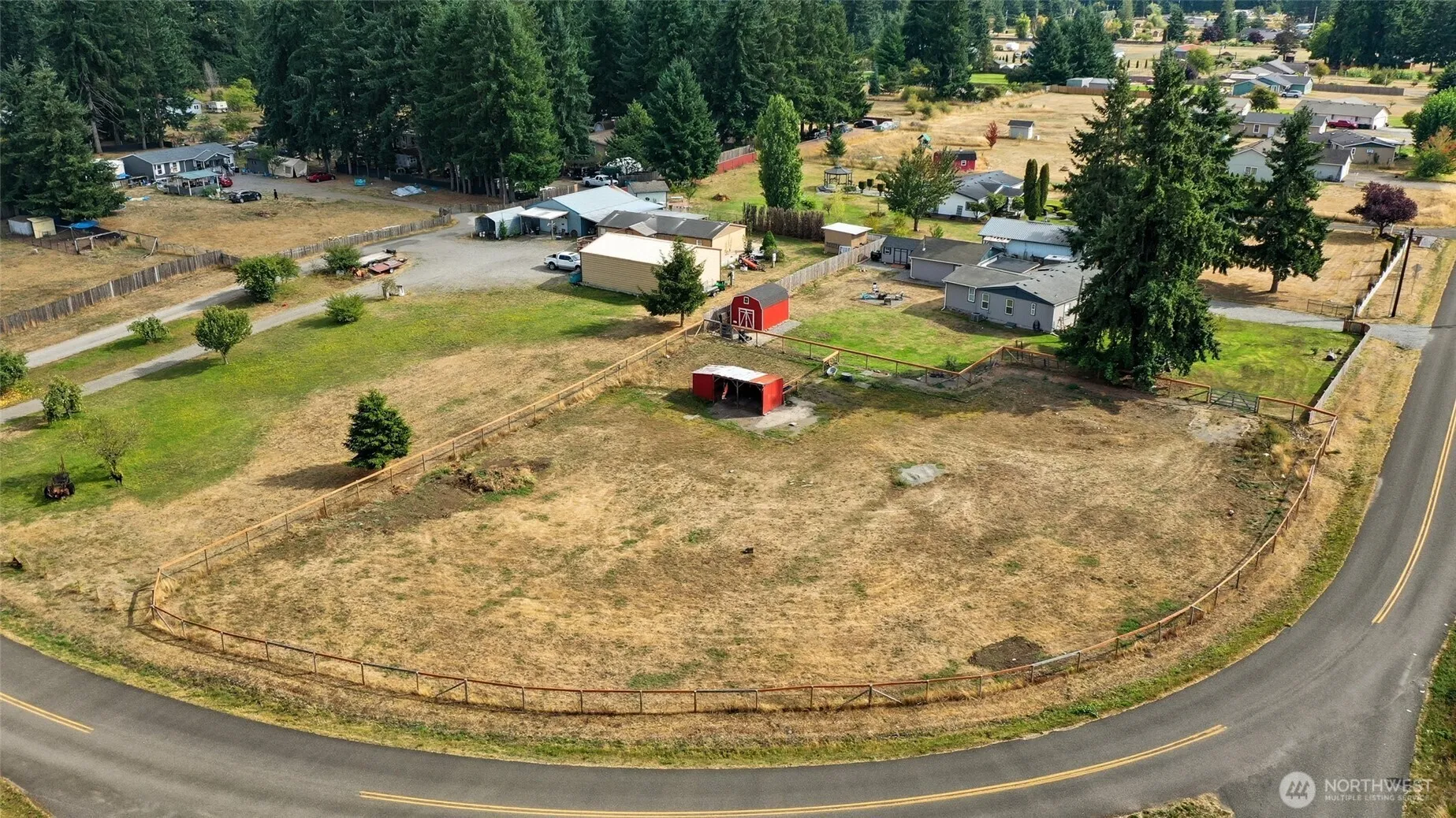 Comfortable Private Gated & Completely Remodeled “Farm House” MFH on a fully fenced HORSE READY corner lot! Pasture with run-in shelter, storage shed & electric fencing, just bring your energizer. Lighthoof Mud Management system in run-in shelter & along fence line, a must-have feature for experienced horse owners! Red Barn perfect for hay storage. House is move-in ready with 3 bedrooms, 1 3/4 bath. Primary suite with barn doors, custom closet system, & roomy ensuite including walk-in shower. Modern white cabinets & trim package, plantation blinds. Farmhouse sink, ample storage & Kitchen eat-in space. Vaulted ceilings & lots of room in the main living space- PLUS outdoor Covered Private Patio area & oversized detached garage. Must see!