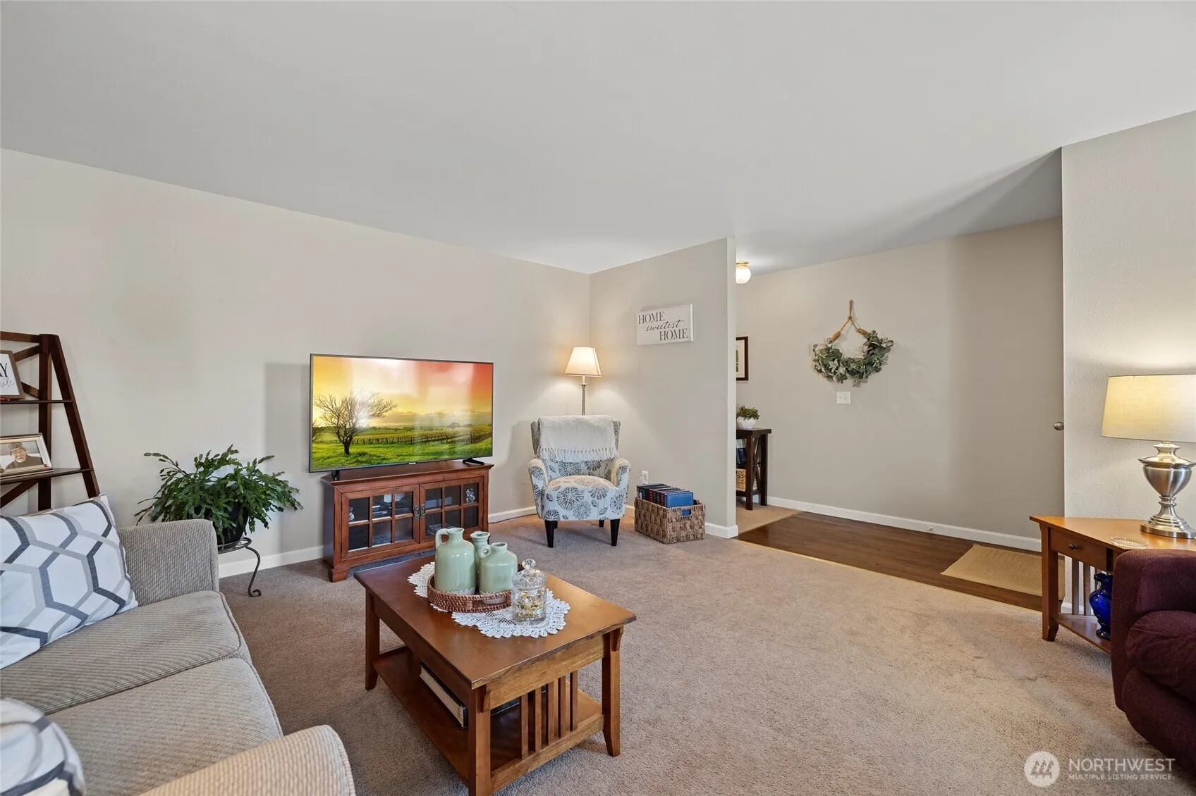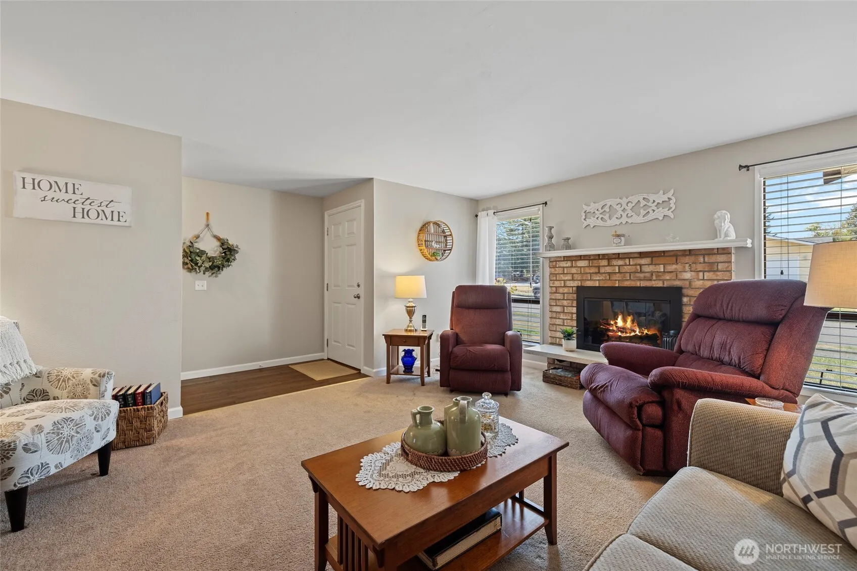 Discover this impeccably maintained single-story home, ideally located close to town, medical services, schools, and shopping, with freeway access just minutes away! Enjoy a serene fenced backyard with mature trees, lush landscaping, a covered deck, and a stamped concrete patio—perfect for relaxing or entertaining. The inviting living room features a cozy brick wood-burning fireplace. The primary bedroom includes a 3/4 bathroom, plus two additional bedrooms and a full hall bathroom. The eat-in kitchen offers space for a dining table and a sliding door to the deck. Updated in 2009 with new flooring, paint, roof, and furnace, this charming home blends classic style with modern comfort.