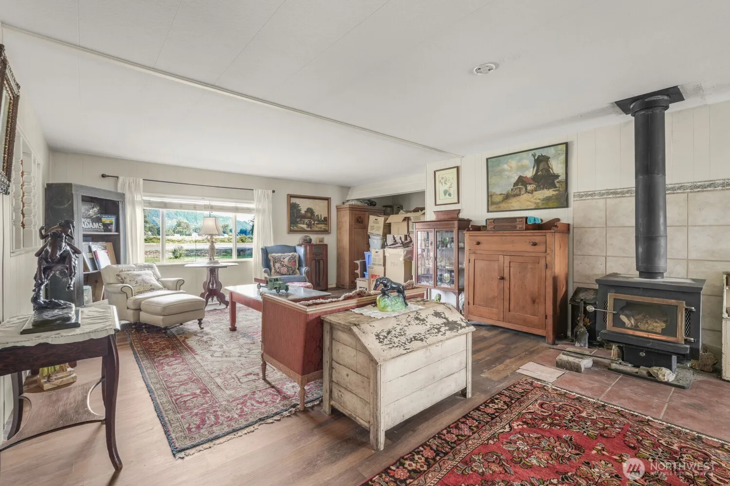 Island Property! Over 11 acres of level, usable land with no wasted space. This updated 1978 triple-wide manufactured home offers new LVP and carpet, fresh paint inside and out, and vinyl windows throughout. A covered front porch (11×20) and spacious back deck (12×22) invite relaxation and gatherings. Inside are 3 bedrooms, 2 baths, a primary suite with walk-in closet, a large living room with wood stove, and a separate family room. Outbuildings include a three-bay equipment building, shop and barn (47×13 and 13×27) with power and water, plus a loafing barn and utility shed with 120/210 service. About an acre is fenced with pasture beyond, abundant wildlife, and peaceful scenery.