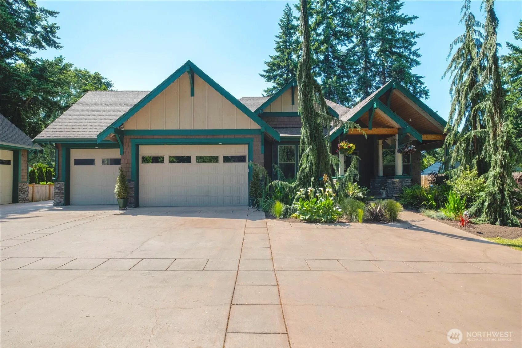 Don’t miss this private lodge style sanctuary! The flat almost ½-acre lot with private drive & gated entry boasts a one-story 2014 custom-built home that is a car collector’s dream! It has an oversized 3-car attached garage + 4-car detached shop w/½ bath & 10’ doors for your RV/boat. The home has a grand covered entry that leads to sizable foyer w/adjacent office, vaulted ceilings & an open great room w/gas fireplace, dining area, & cook’s kitchen. The luxurious primary suite features a spa-style bath. Step outside to the 422+ SF covered patio w/fireplace, built-in BBQ & TV wiring. Fenced yard w/fruit trees and a garden of raised beds- your urban farm to table awaits! Mature landscaping throughout. Sewer connected. Minutes from I-5 and 509.