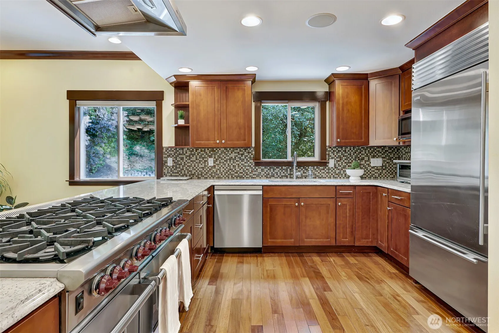 Experience elevated living in this stunning custom contemporary, perched atop a quiet cul-de-sac offering privacy & territorial views. Walls of windows flood the home with natural light, while the gourmet kitchen with high-end appliances, quartz counters and spacious eating area anchors the home. Entertain with ease as living and dining flow to a expansive rooftop deck. Main floor includes Brazilian mahogany floors, gas fireplace, ½ bath, laundry, and bedroom/office with ¾ bath. Upstairs: 3 bedrooms including a luxe primary suite w/huge walk-in closet & option for 2nd laundry. Lower level offers a rec room, kitchenette, ¾ bath, and music studio. 2-car garage w/high ceilings, LFP Civic Club deeded, award-winning schools, near Light Rail.
