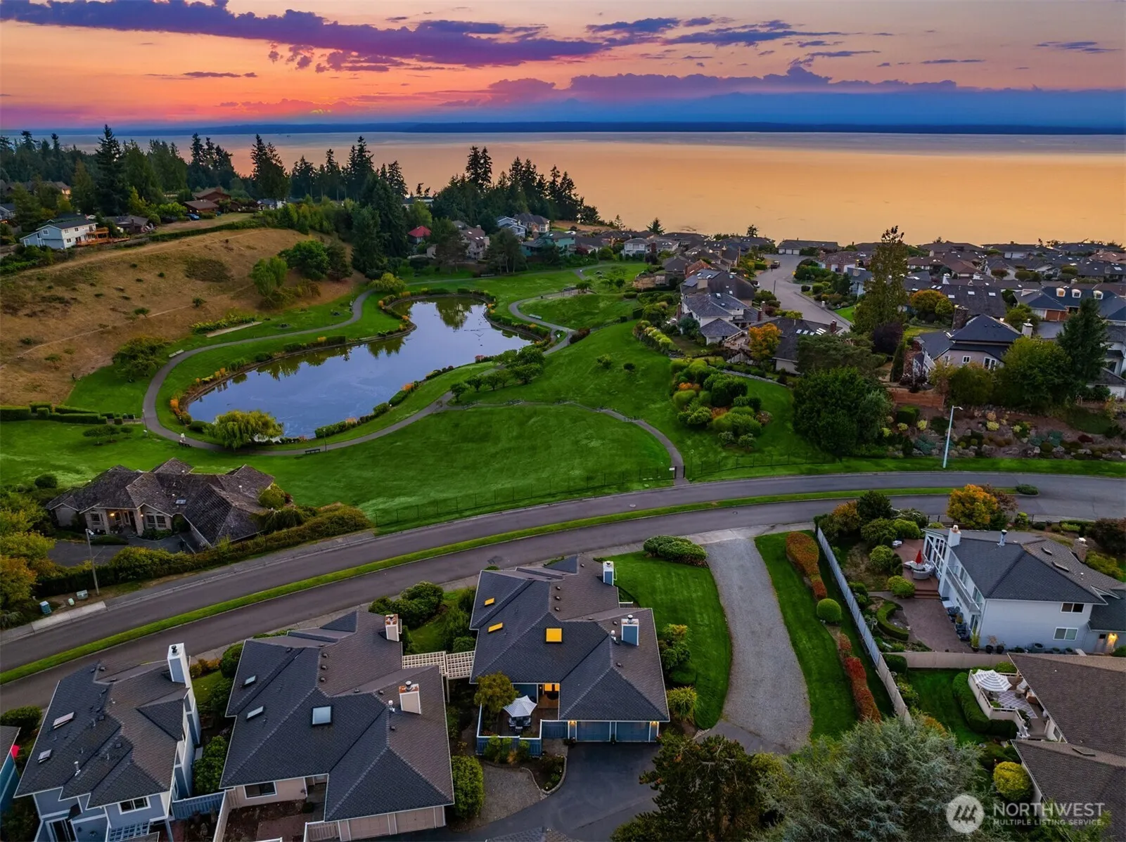 Prominently poised in coveted Waterside at Picnic Point with spectacular sunsets sprawling from your private park with pond & fountains to the Puget Sound & Olympics, this detached easy-living rambler is like your own luxury home with the low-maintenance of a condo! Timeless contemporary design brilliantly laid out to embrace stunning views. Elegantly appointed with white oak floors & sophisticated upscale finishes throughout. Grand foyer opens to formal dining with built-in buffet & living room with cathedral ceilings, soaring windows & marble fireplace. Cherry kitchen with granite bar opens to family room with slate fireplace & patio. Spacious primary with lavish ensuite. Prime corner lot with enclosed courtyard, garage, parking pad & AC!