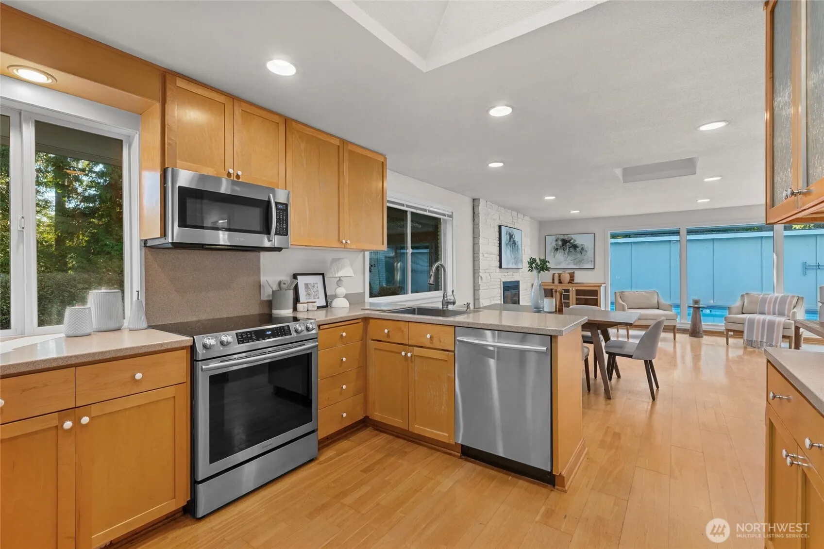Stunning daylight Rambler tucked among towering evergreens, offering serene privacy and a tranquil, park-like setting. It backs directly to Meadowdale Park trails winding to scenic Browns Bay. Both levels are fully accessible and stair-free, with a separate downstairs entry plus kitchen for effortless living. Floor-to-ceiling windows fill 2,396 sq.ft. with natural light, framing peaceful park views. The updated kitchen features new cabinets and stainless-steel appliances. Entertain with ease beside the in-ground pool and expansive, sun-drenched deck. A charming 398-sq.ft. studio cabin in the woods with full kitchen, ¾ bath, and fireplace is perfect for guests or rental income. A rare Edmonds retreat near schools, shopping, and highways.