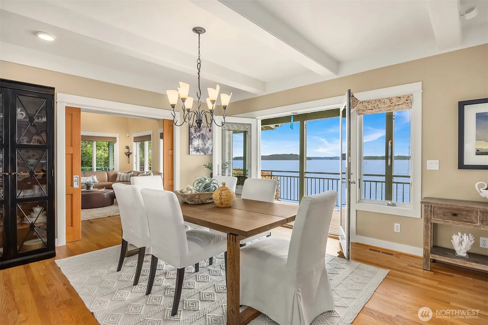 Elegantly Curated Waterfront Home on the Quiet Shores of South Beach. This gracious residence provides comfort and relaxation with attention and care to every detail. The expansive living room flows to the dining area, opening to the large wrap around deck, perfect for morning coffee and evening dinners. The chef’s kitchen, thoughtfully designed for function and beauty, w/ stunning Cristallo quartzite counters, rich custom cabinetry, handblown glass pendant lighting and high end appliances. The primary suite is a sanctuary with endless views from the balcony, a fireplace and spa bath w/sauna. Three additional view bedrooms and office all open to outdoor spaces. Enjoy beach combing, lounge areas, patios, fire pit, cutting garden&fruit trees.