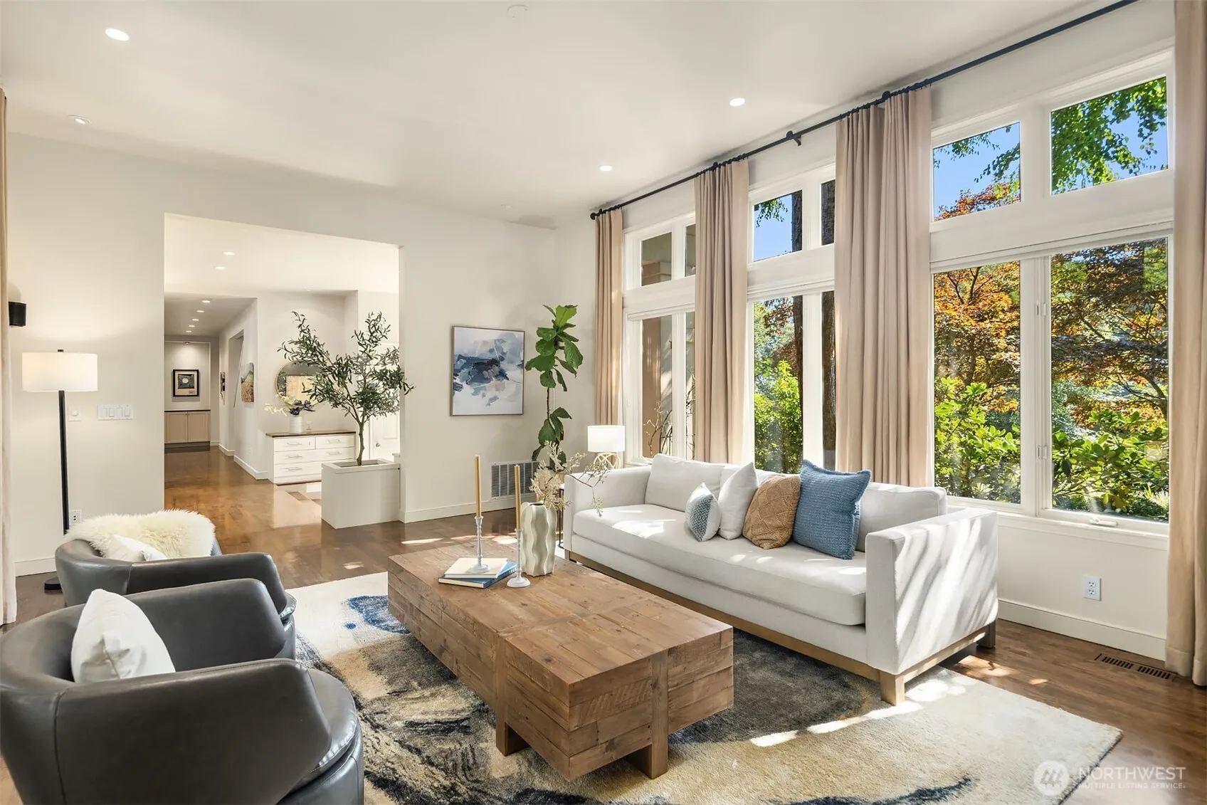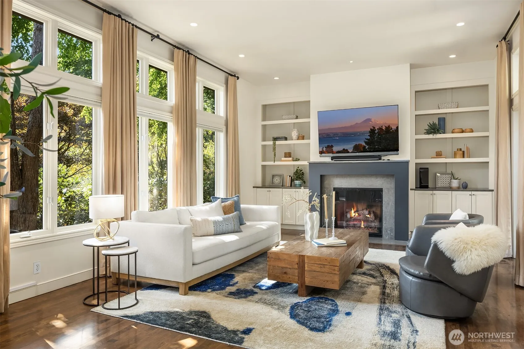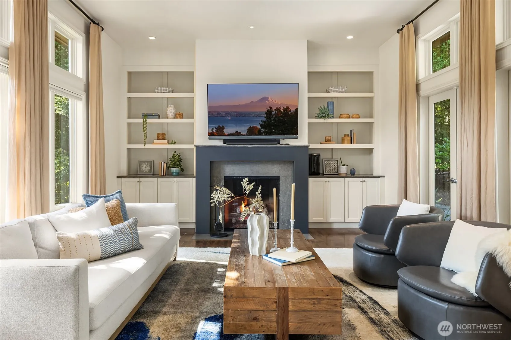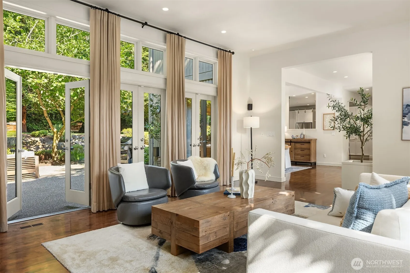 Stunning custom Odegard Gockel design blends soaring ceilings, ideal floorplan & everyday comfort. Gather in the open kitchen and great room that flow effortlessly to the sun-drenched patio & flat backyard—ideal for entertaining or play. Retreat to the private office with its own sunny deck (perfect for WFH!), or unwind in the spacious primary suite w/ fireplace, Juliet balcony, gorgeously remodeled bath & walk-in closet. Fantastic layout: main-level guest BDR + 3 additional BDRs up w/ bonus room. Updates: all 3 bathrooms & laundry, extended maple hardwoods, new carpet, Trex deck, finished 3-car garage w/ epoxy floor, A/C. Prime location in quiet neighborhood setting—walk to Pioneer Park, shops & Clark Beach. Mercer Island at its best!