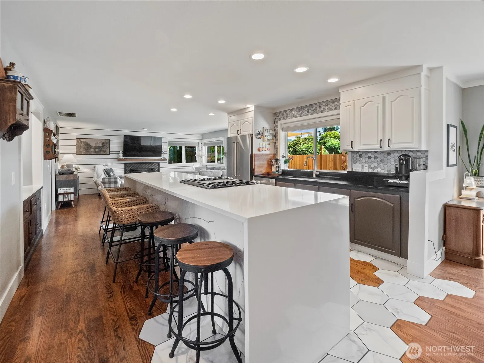 Immaculate 2,230 SF, 4 bed, 2.5 bath, Flensted rambler w/ detached 22′ X 30′ 2-car shop on a 10,711SF corner lot. Updated kitchen w/ gas range, huge island bar w/ seating for 6, & quartz countertops that opens to the family room w/ gas fireplace insert. Primary suite w/ walk-in closet includes a fully renovated 5 pc. bath w/ tile floors, dual vanities, marble countertops, free-standing soaking tub & custom tile shower. Spacious vaulted formal living room. Hard surface flooring throughout. Awesome covered outdoor space for entertaining + raised garden beds w/ mature blueberries. Gated RV parking w/ dump & 110V power. 50-year Presidential Comp roof. Vinyl windows. Forced air gas heat w/ A/C. Not many like this one in Enumclaw!!