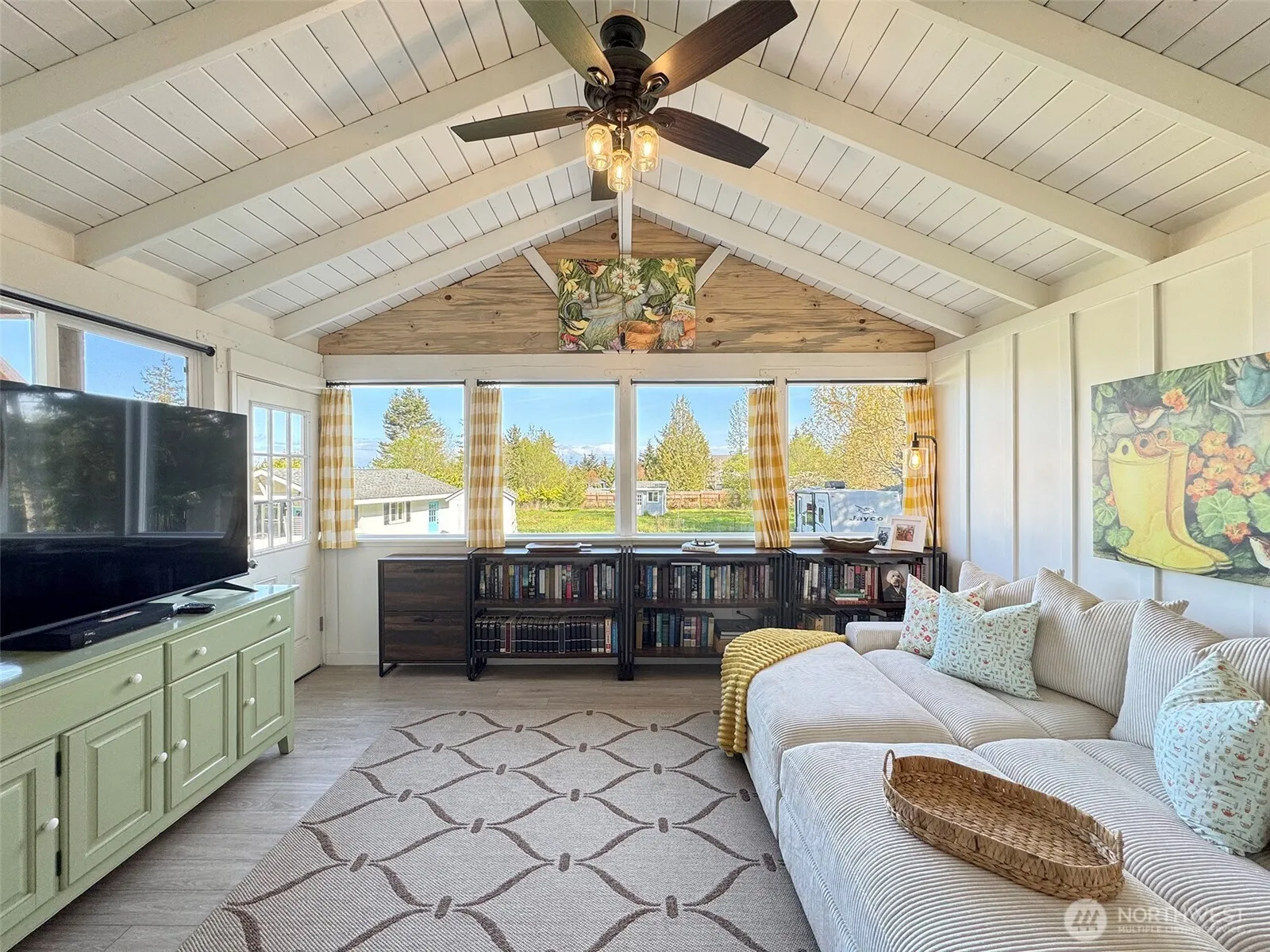 A place to hang your heart: main house has 1492 sq ft with 3 BR & 2 BA, great view of the Olympic Mtns, & peek-a-boo water view from the back deck. Your first impression will be “cute, charming, enchanting”! The living room has a vaulted ceiling and a cozy free-standing wood stove & the sun-filled family room is equally delightful . The all white kitchen has a farm sink & new refrigerator & microwave with adjoining dining area. The solid surface flooring makes it easy care. Additional 400 sq ft in the detached cottage that has a kitchenette w/sink, wall of bookcases, fenced front yard. Artist studio, library? It is located on a landscaped acre with a fire pit, 3 sheds, fenced backyard, & garage. Convenient to Sequim & Port Angeles.