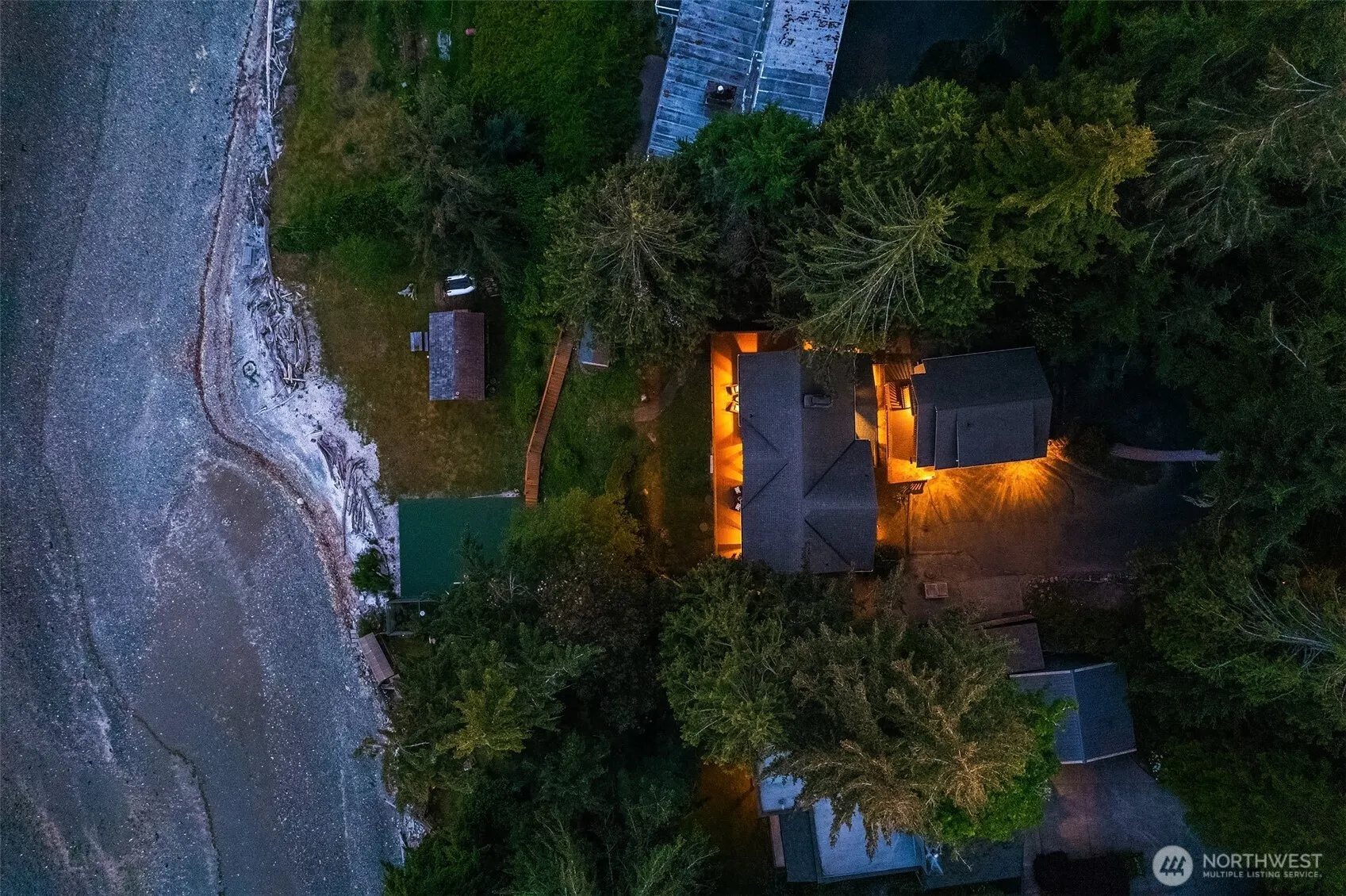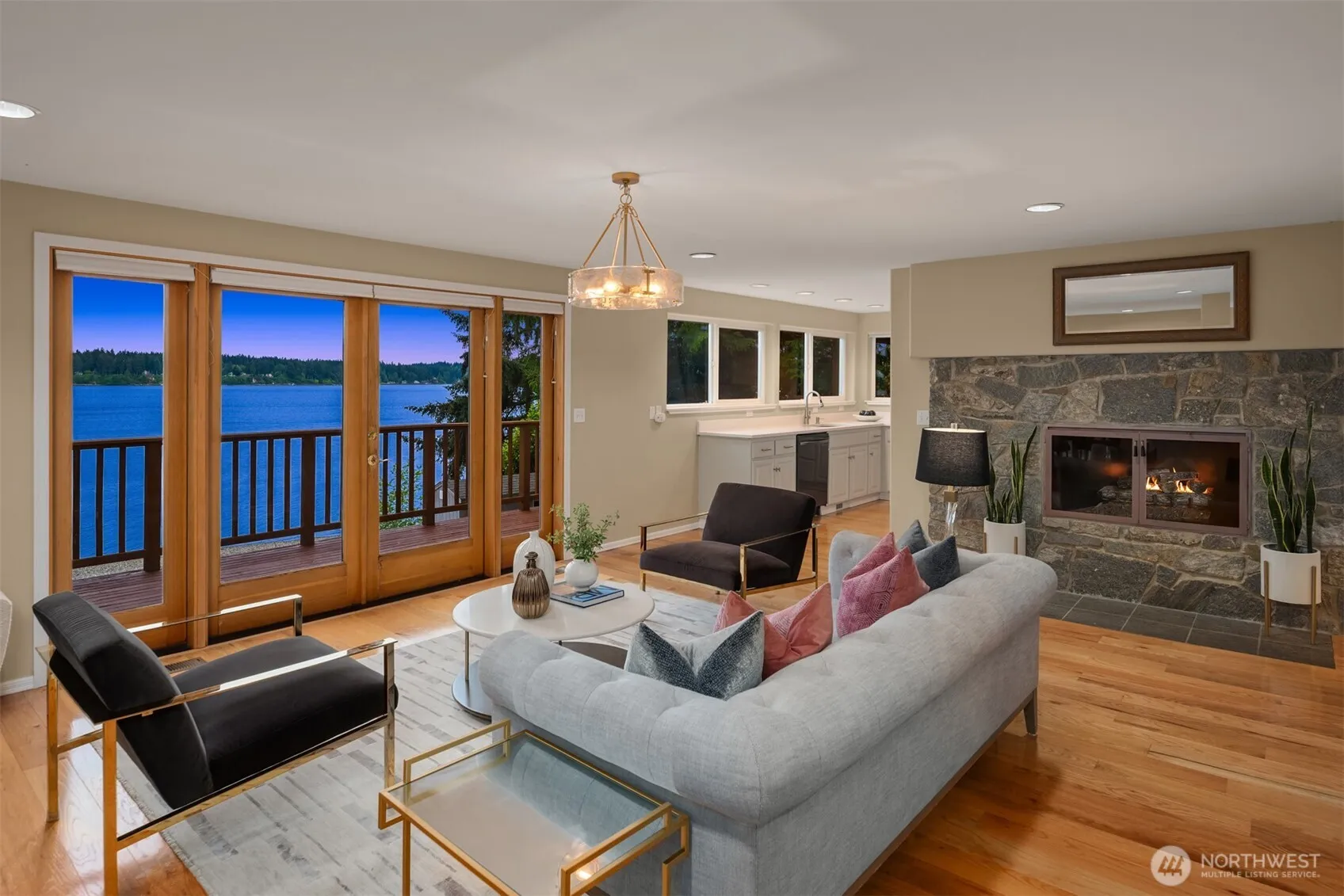 Nestled near the end of a quiet residential road + directly on the waterfront, this Poulsbo estate blends natural beauty with modern luxury. Natural light fills spacious open-concept main living level. French doors lead graciously to expansive deck overlooking Agate Passage. Primary suite occupies entire upper level, offering balcony, home office, walk-in closet, exercise studio, + spa-like bath featuring soaking tub. Flexible space on lower level with media room, bedroom + bonus room. Stairs lead to private 82-foot shoreline with great entertainment facilities including cabana, sports court + mooring buoy. Finished space above two-car garage offers many possibilities. Minutes to Bainbridge Island ferries.