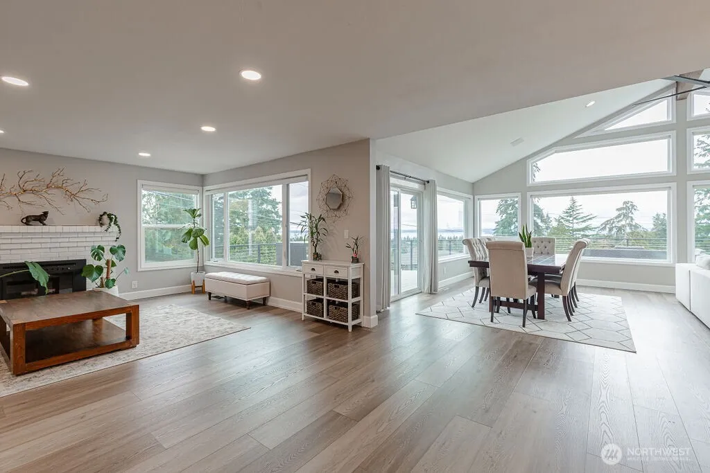 This stunning open-concept home perfectly blends modern elegance w/natural beauty, offering breathtaking panoramic views of the sound & Olympic Mountains. Expansive floor-to-ceiling windows flood the space w/natural light, showcasing lush evergreens & tranquil waters beyond. Vaulted ceilings & soft neutral tones enhance the airy atmosphere, while warm hardwood floors provide a cozy contrast. A sleek fireplace w/ a white brick surround adds charm, complemented by tasteful greenery & contemporary decor. The dining area, set against a scenic backdrop, invites memorable gatherings, while the adjoining deck & hot tub offer seamless indoor-outdoor living. This home is a perfect retreat for those who appreciate sophistication & nature’s splendor.