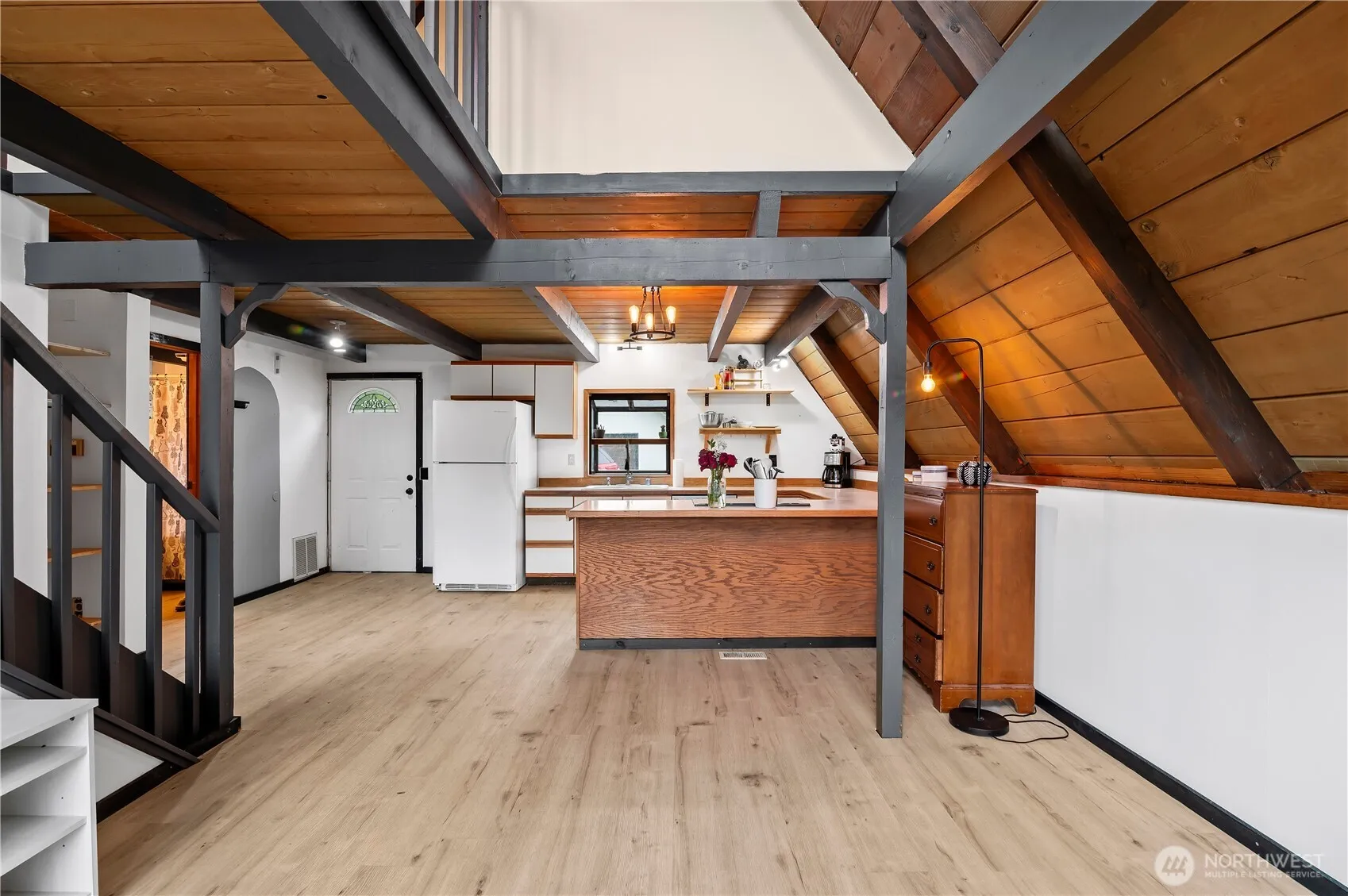A-frame retreat on Camano Island! Nestled on 1.75 acres across two parcels, this unique home is surrounded by trees for ultimate privacy. Inside, enjoy the open-beam design w/ vaulted ceilings, bright kitchen with garden window, and an open kitchen/great room layout filled with natural light from large windows. An open spindle staircase leads to a cozy loft bedroom, while the main floor offers another bedroom and a full bath. The lower level features a flexible space currently used as a primary suite, plus laundry with ½ bath. Step outside to spacious decks overlooking the yard with fruit trees, greenhouse, and plenty of garden space. Detached garage and shed included. Private setting with room to spread out — Island living at its best!